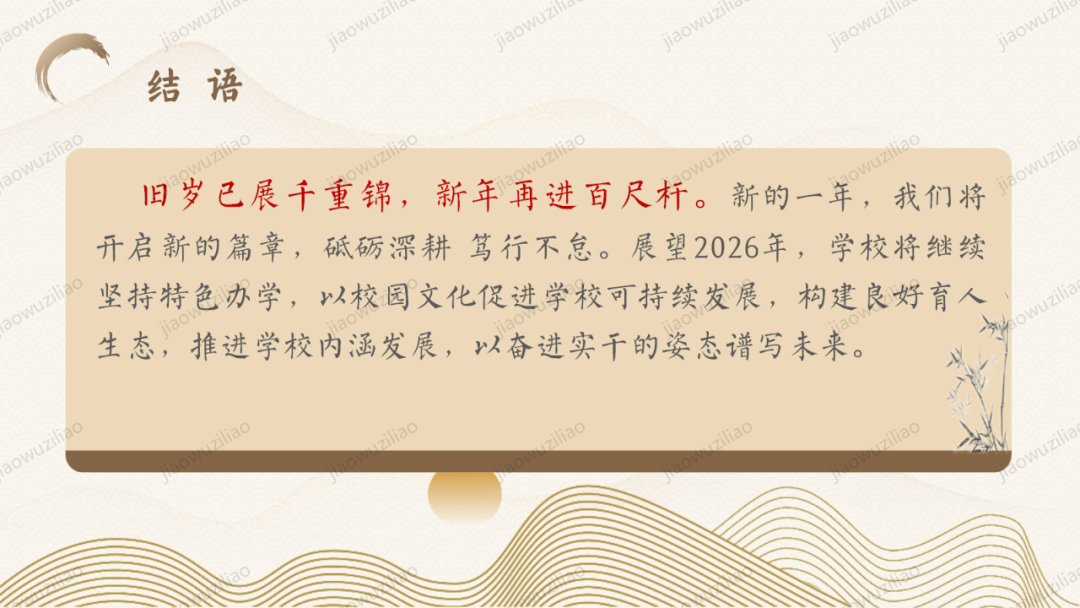 时光荏苒,岁月鎏金。回望 2025 年,全校上下凝心聚力、同心同德,深耕教育初心,笃行育人使命,在坚守中奋进,在实干中成长,各项工作稳步推进、硕果丰盈。深耕致远凝合力,笃行实干再扬帆。现将本年度学校各项工作情况总结汇报如下,立足过往沉淀经验,锚定目标谋划新篇,凝心聚力共谱学校发展崭新华章。