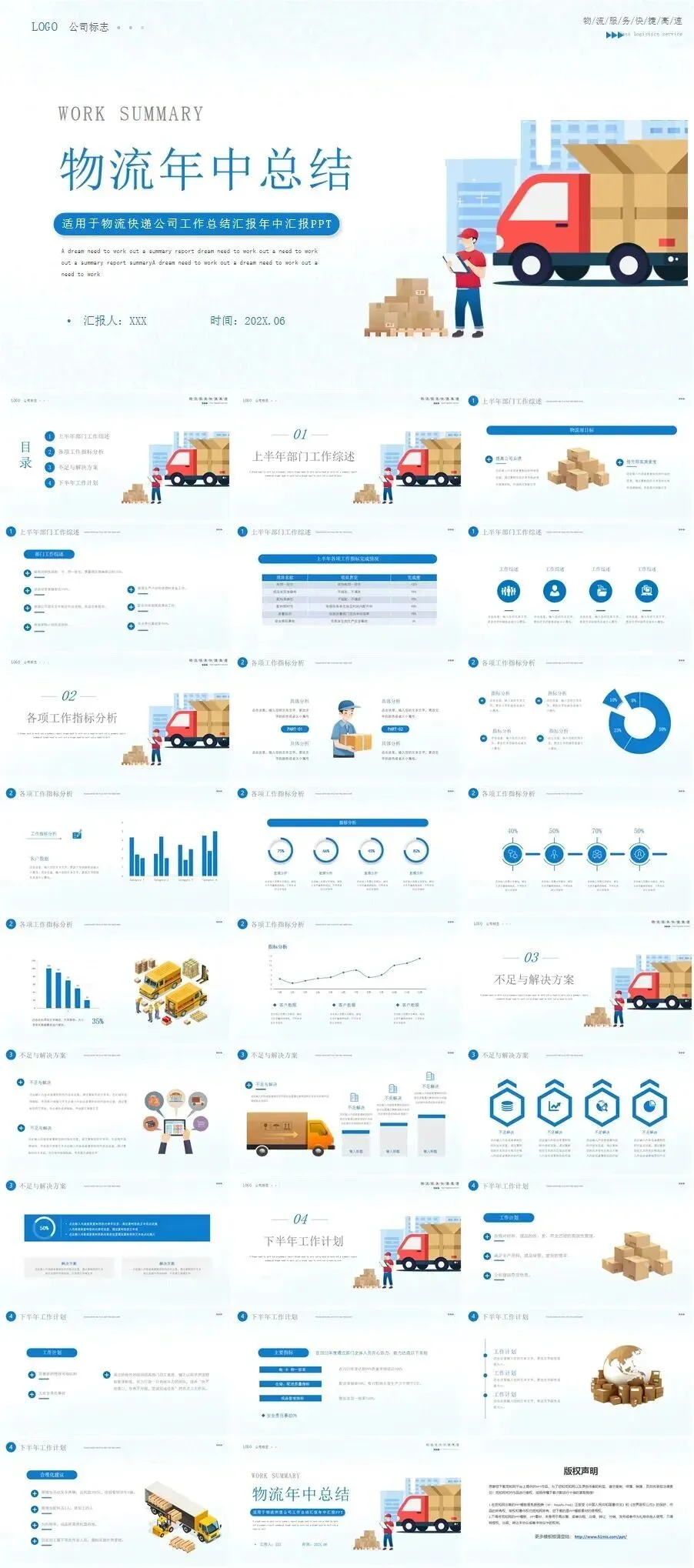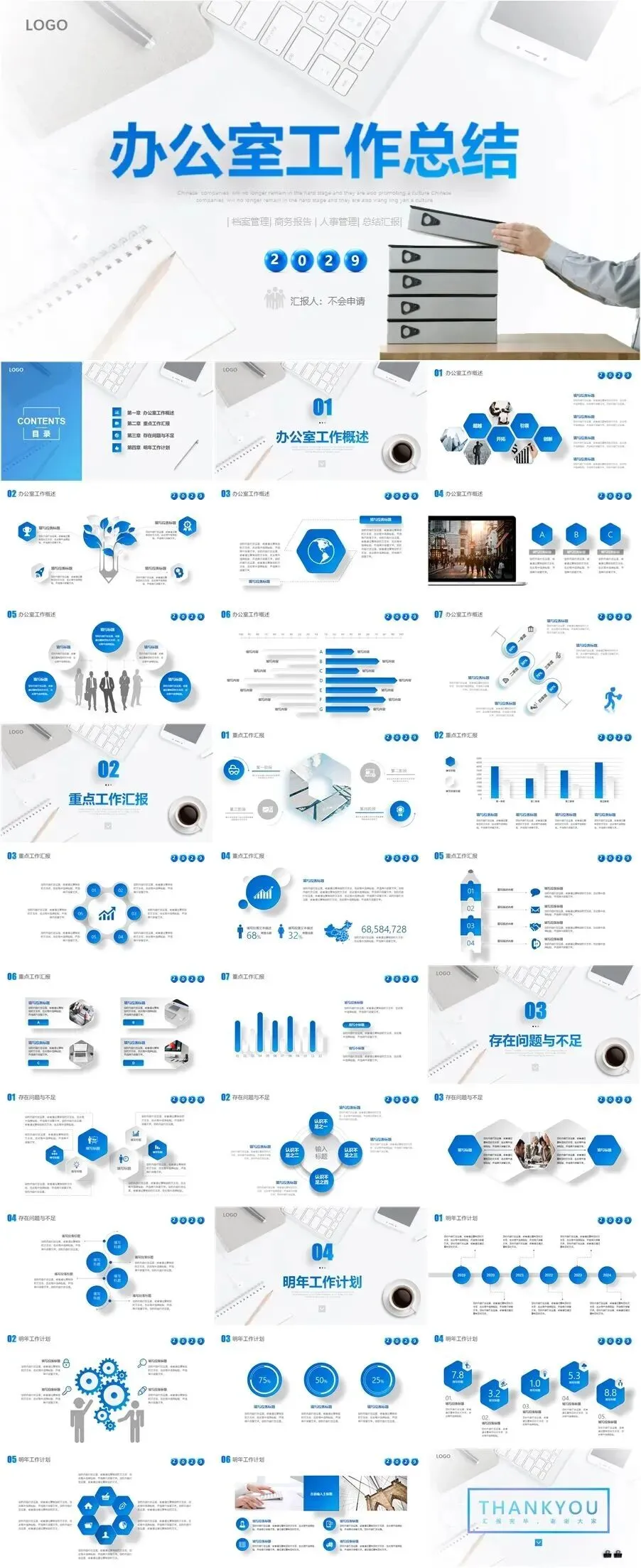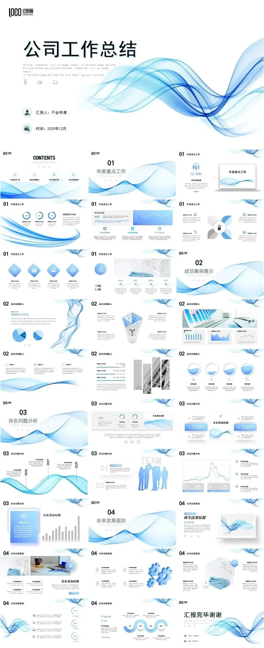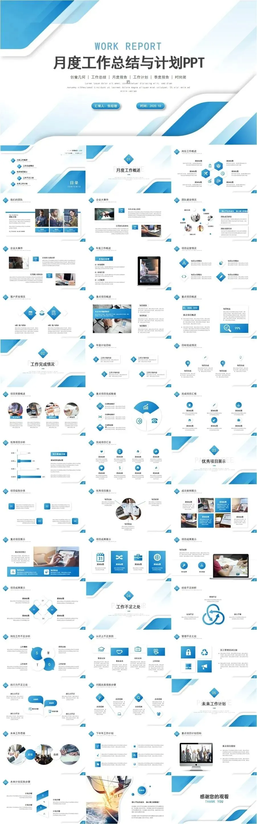 12套简约大气高级感动态蓝色月工作总结计划述职报告PPT模板