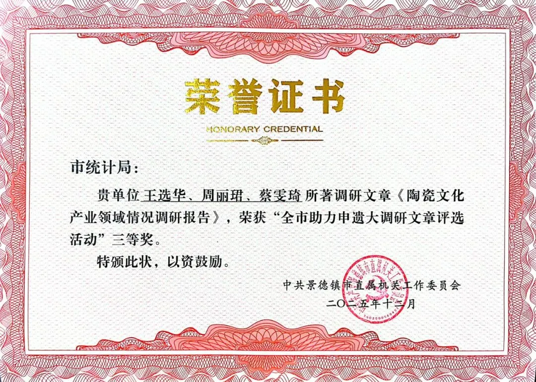 为深入学习贯彻党的二十大和二十届二中、三中、四中全会精神,全面贯彻落实习近平文化思想、习近平总书记考察江西重要讲话精神,助力打好申遗攻坚战,市直机关工委开展了助力申遗大调研活动,市统计局积极参与并开展了调研,撰写一篇课题报告荣获三等奖。