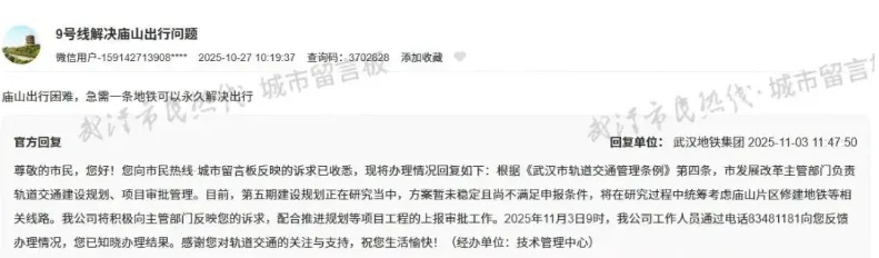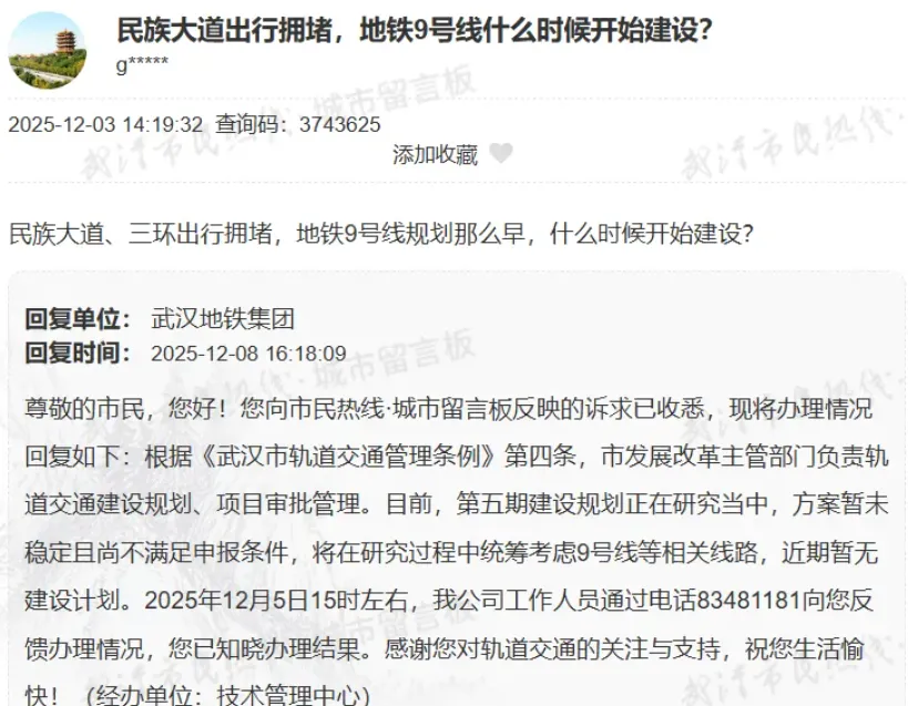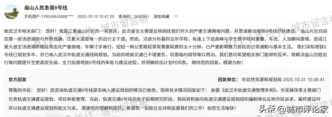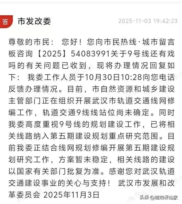 因此,从实际层面上来讲,只有地铁9号线被纳入第5期规划建设方案,并经过发改委正式批准后才会正式开工建设,让我们拭目以待!在此之前,武汉市三大权威部门对于地铁9号线均作出了正式回复,具体如下:来源武汉城市留言板