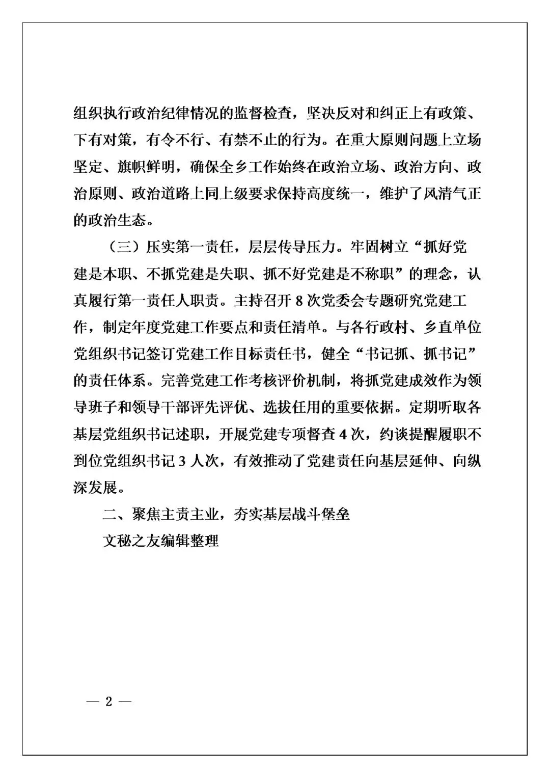 我提一下语言,它是乡党建述职该有的调调——“抓好党建是本职”“书记抓、抓书记”材料中这些话,是基层常说的实在表述,贴合党建材料的正式语境,不堆砌辞藻,像“约谈提醒3人次”这类具体表述,是接足了乡一级工作的地气。