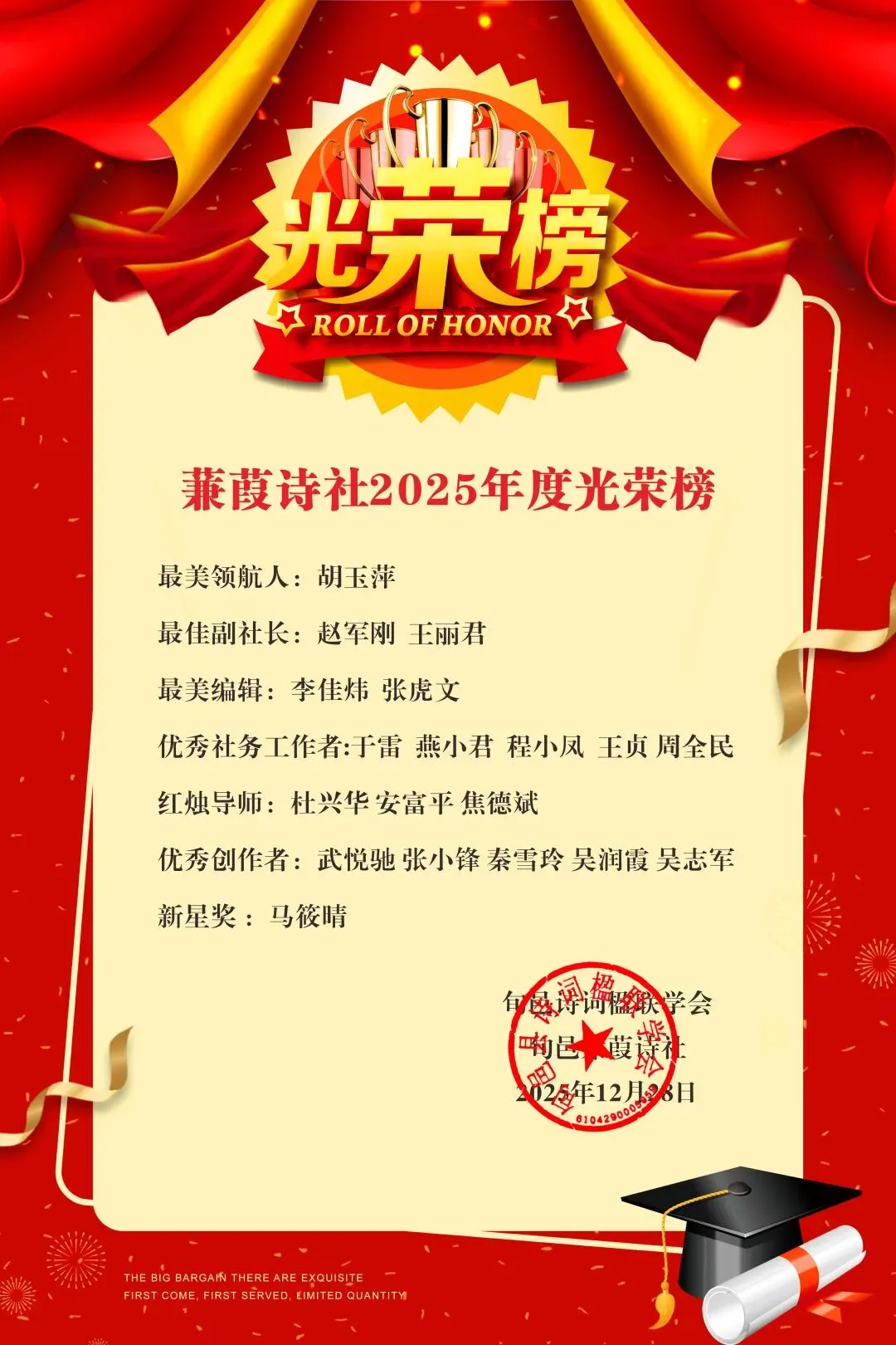 随后,常务副社长赵军刚宣读2025年度社务工作优秀人员名单,胡玉萍获“最美领航人”称号,赵军刚、王丽君获评“最佳副社长”,李佳炜、张虎文被授予“最美编辑”,于雷等5人获“优秀社务工作者”,杜兴华等3人当选“红烛导师”,武悦驰等5人获评“优秀创作者”,马筱晴荣获“新星奖”。