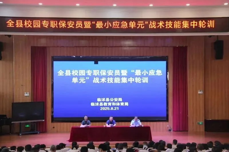 8月21日,临沭县专职保安员暨“最小应急单元”战术技能集中轮训会议在县北城实验学校报告厅召开。会议传达了2025年临沭县校园专职保安员暨“最小应急单元”战术技能集中轮训工作方案,集体观看了由省公安厅制作的培训教学片,并在学校体育馆开展了“实战”演练。