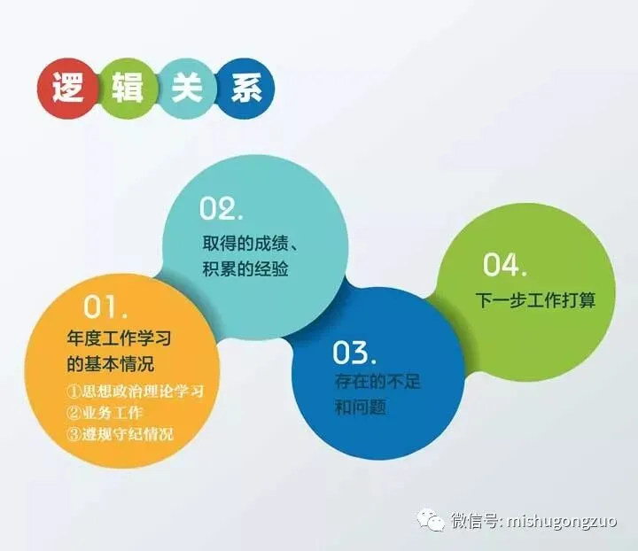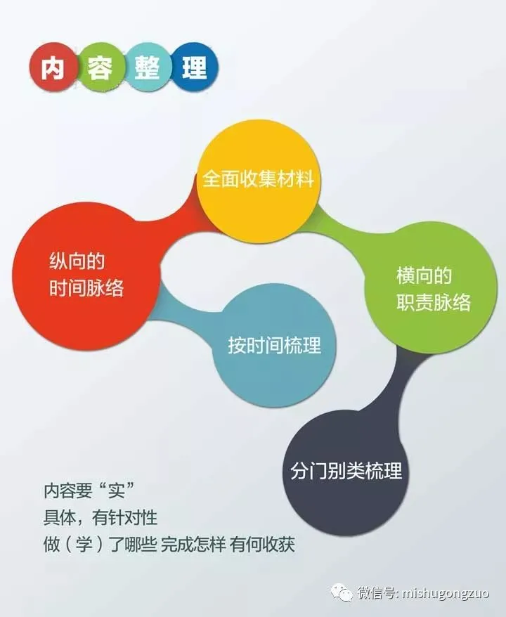 首先要做到全面收集材料。具体可按照两个脉络进行:一是纵向的时间脉络,从年初到年底,把你所做的工作梳理一遍,每个月、每个时间段做了什么,要清清楚楚;二是横向的职责脉络,按照你所从事的工作,分门别类、一项一项汇总材料。纵向和横向两个脉络收集的材料汇集到一起,就形成了比较全面的全年工作坐标系,完成了哪些工作一目了然。