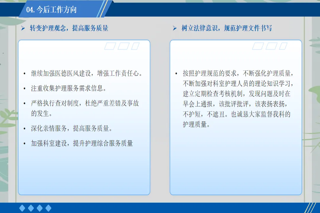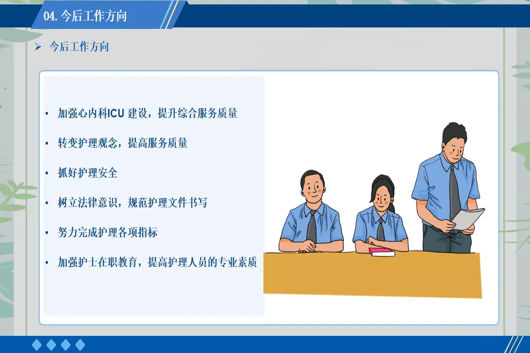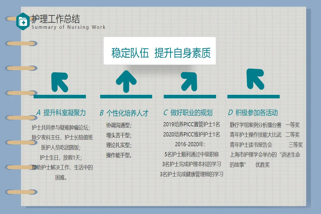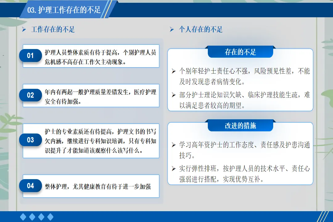 回顾这一年的工作,也存在一些不足之处,如护理科研项目开展较少、部分年轻护士应急处理能力有待提升。在未来的工作中,我将带领团队加强科研学习,组织应急演练,不断提升护理团队的综合能力,为患者提供更优质的护理服务。