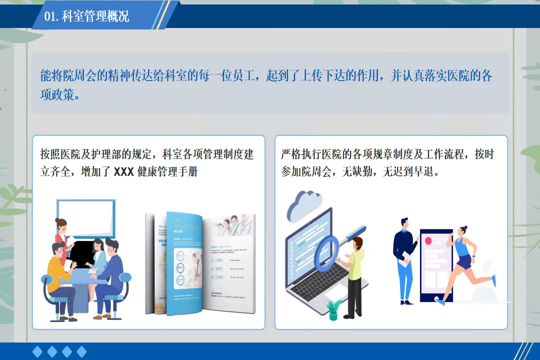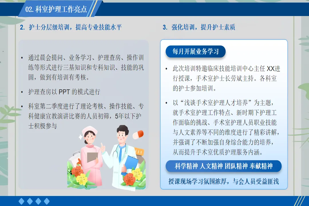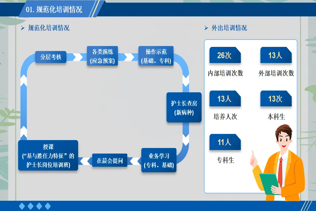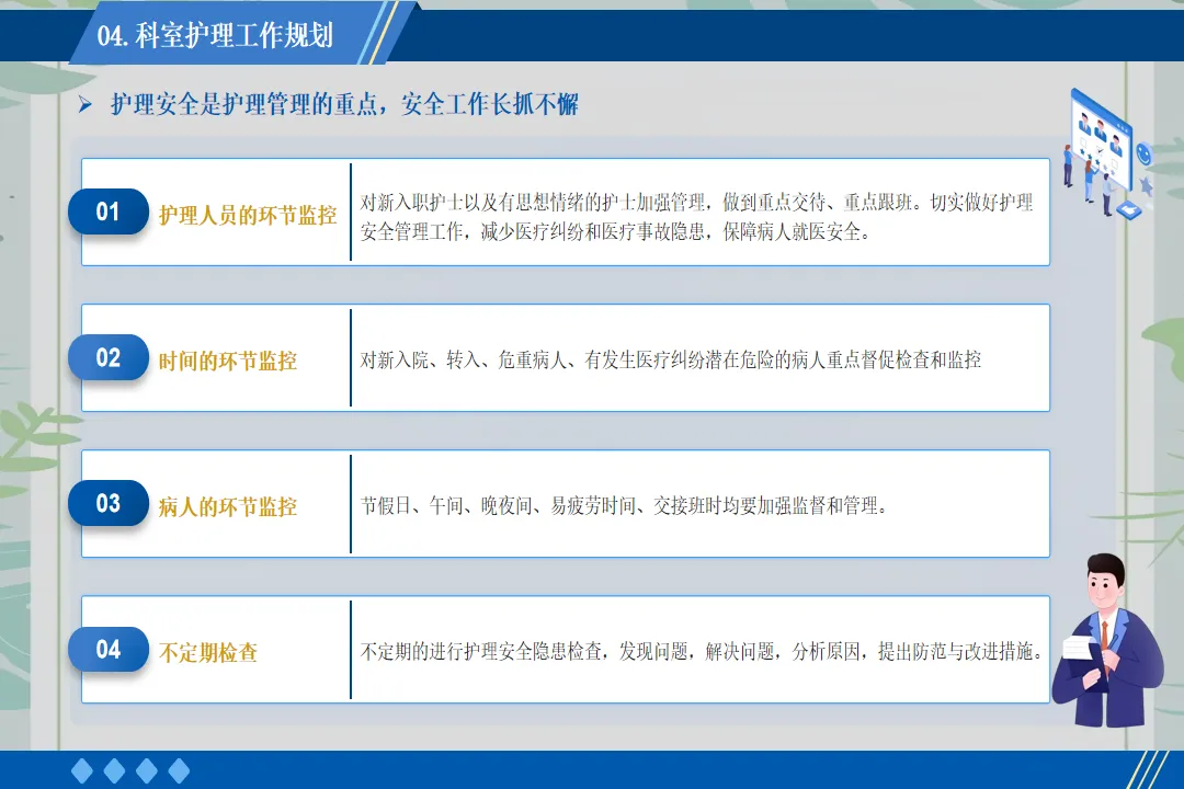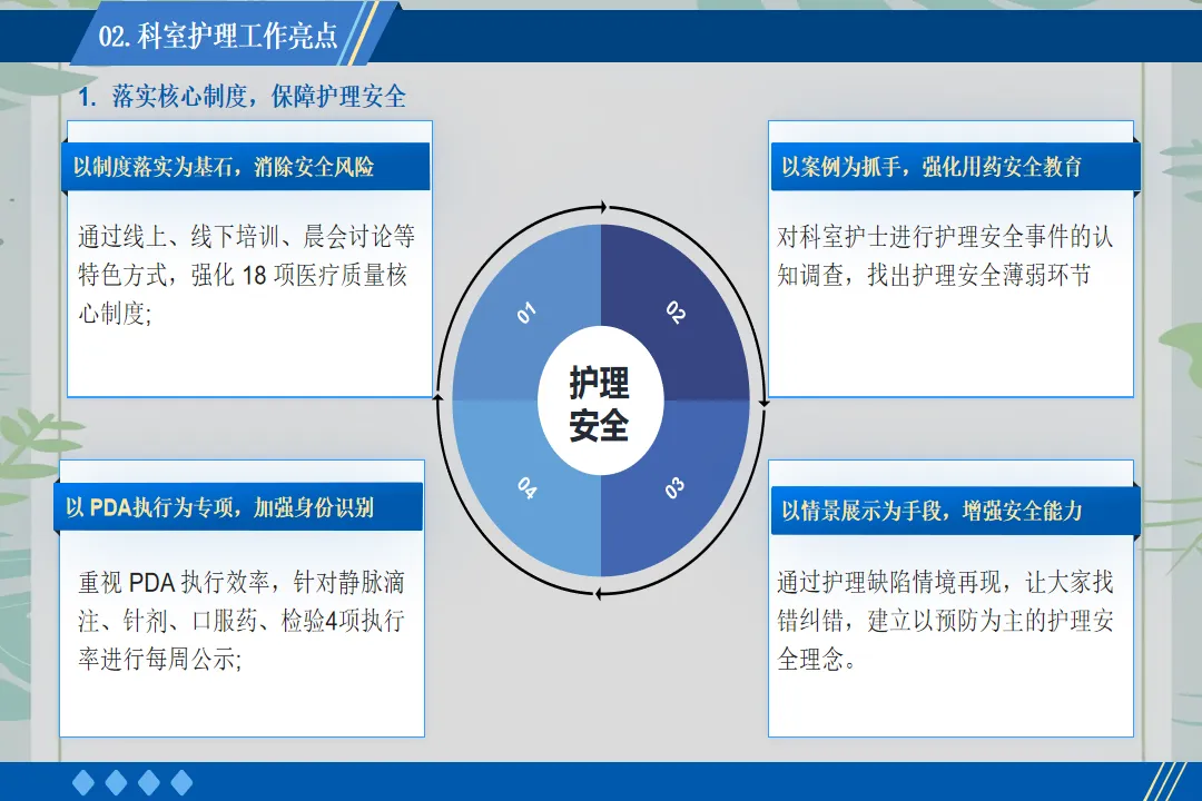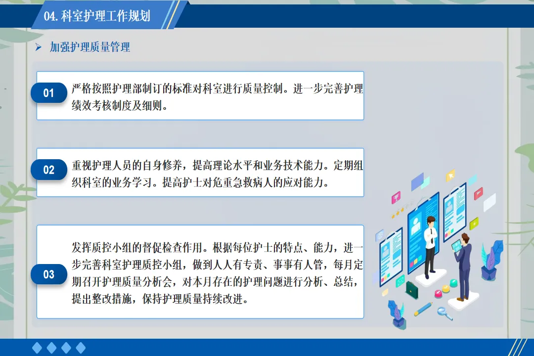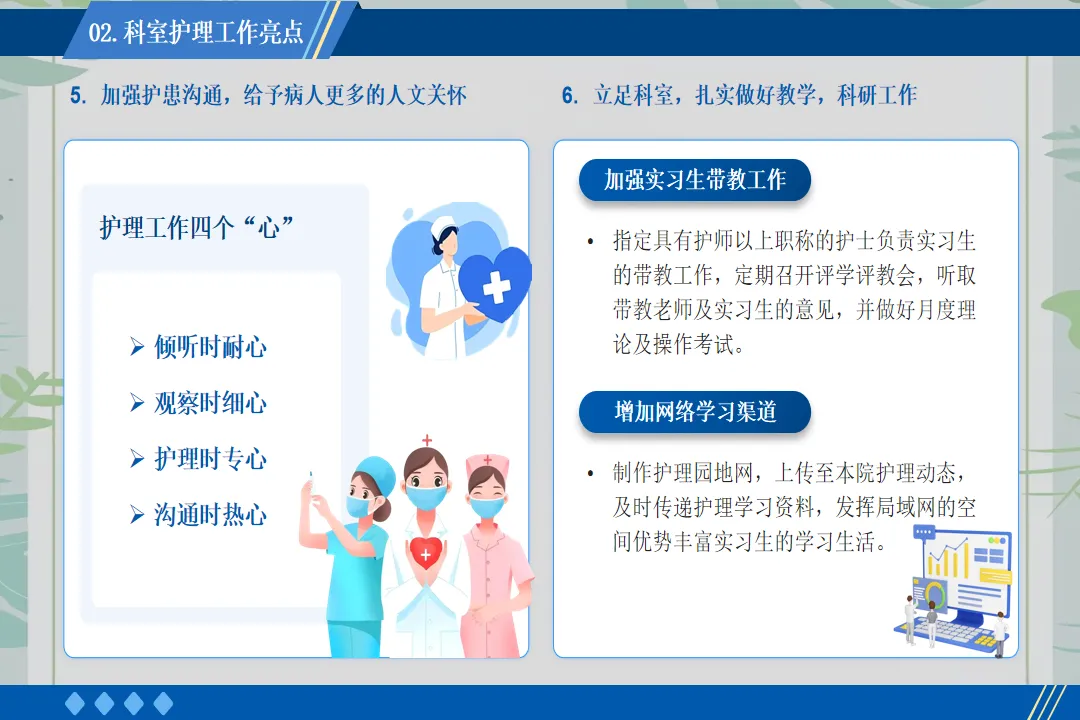 在患者服务上,我推动病区开展“一对一专属护理”服务。为每一位入院患者安排责任护士,建立专属护理档案,从入院评估到出院指导,全程跟踪患者的护理需求。针对老年患者、术后康复患者等特殊群体,制定个性化护理方案,提供更为贴心的服务。例如,为行动不便的患者每日协助翻身、擦洗,为糖尿病患者讲解饮食注意事项,帮助患者更快康复。
