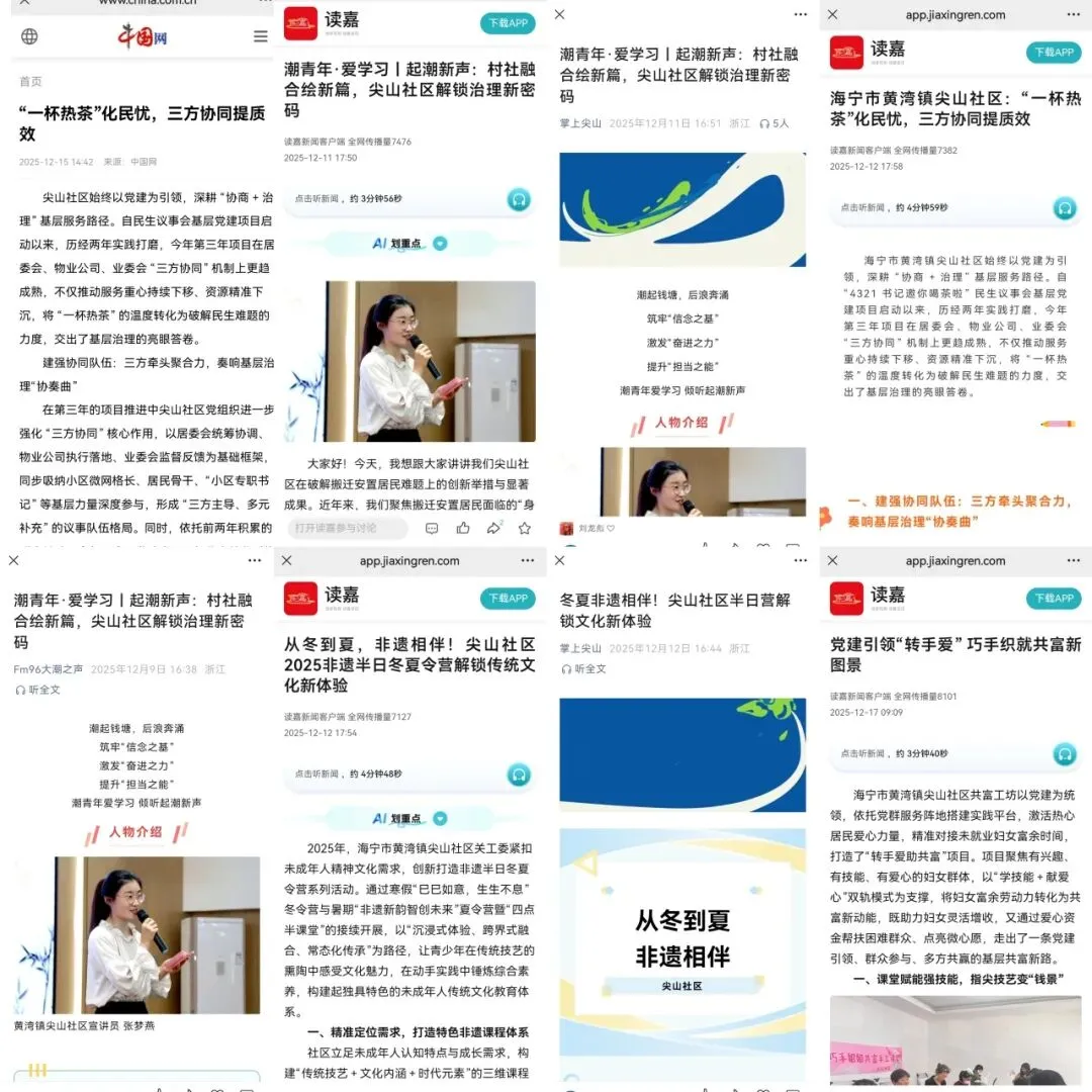 尖山社区12月份共有1篇信息在《中国网》上录用,9篇信息在《读嘉》上录用,1篇信息在《大潮网》上录用,1篇信息在《Fm96大潮之声》上录用,1篇信息在《文明海宁》上录用,4篇信息在《掌上尖山》上录用。