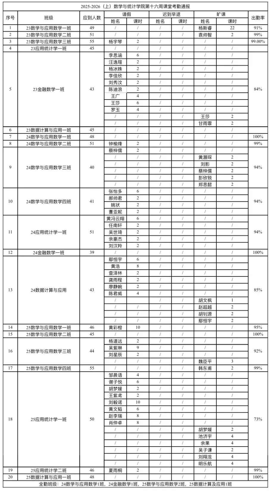 为保障教学工作平稳有序推进,强化同学们的纪律观念,打造优良学习生态,数学与统计学院有序开展第十六周查课活动。