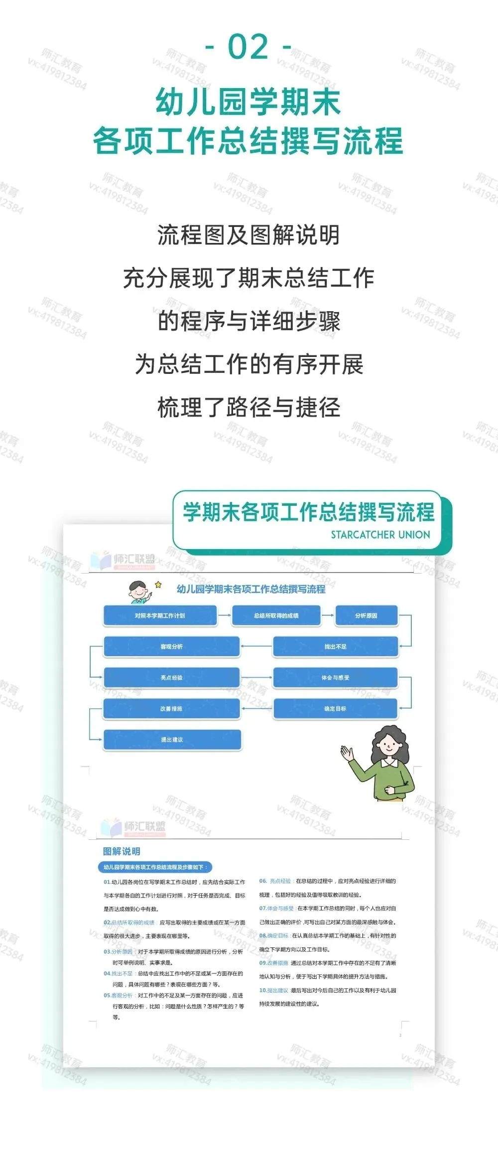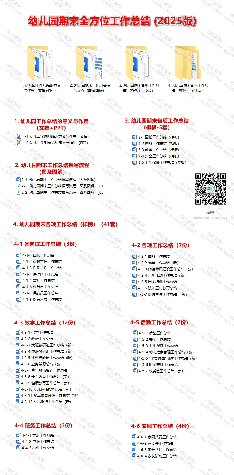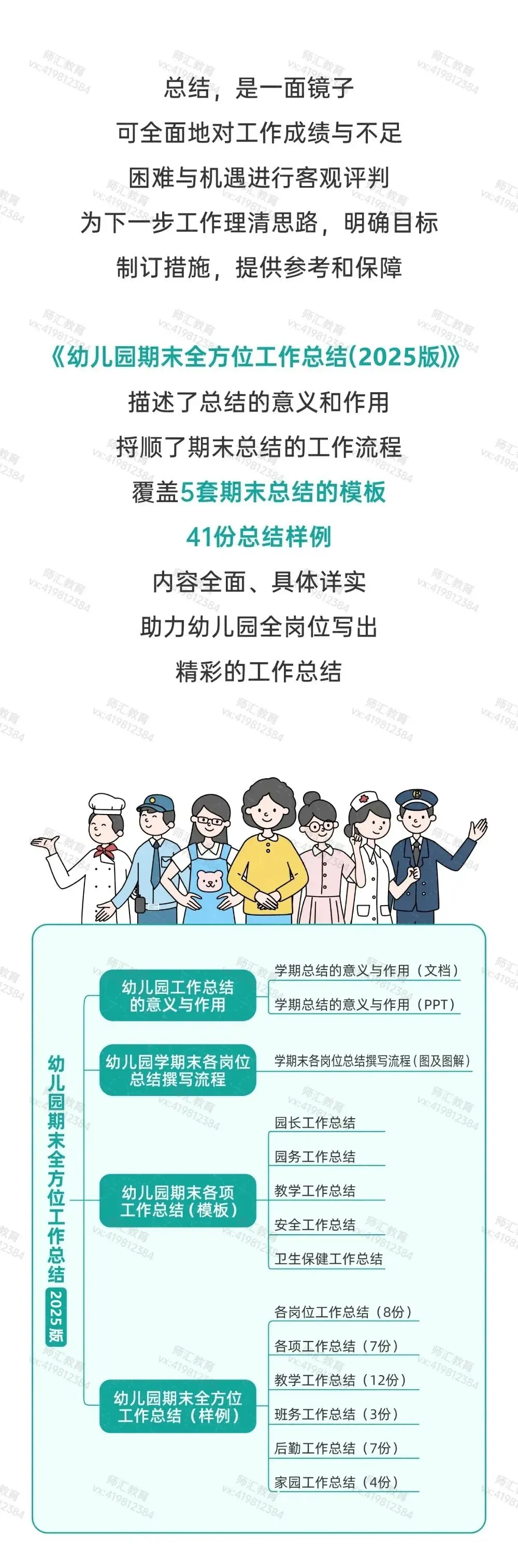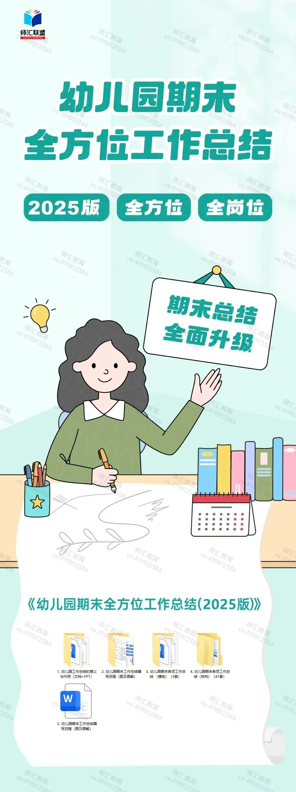 本套资料由师汇联盟整理《幼儿园期末全方位工作总结》(2025版),描述了总结的意义和作用,捋顺了期末总结的工作流程,覆盖5套期末总结的模板,41份总结样例,内容全面、具体详实,助力幼儿园全岗位写出精彩的工作总结!