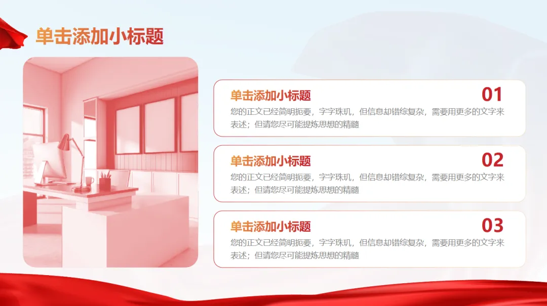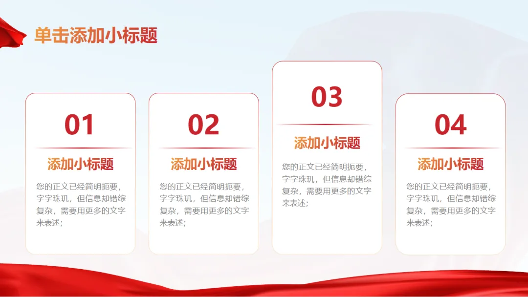 ✅ 风格规范统一:采用红色、深蓝色为主色调,搭配国徽、党徽、红旗等元素,庄重大气,契合党政宣传工作调性;
