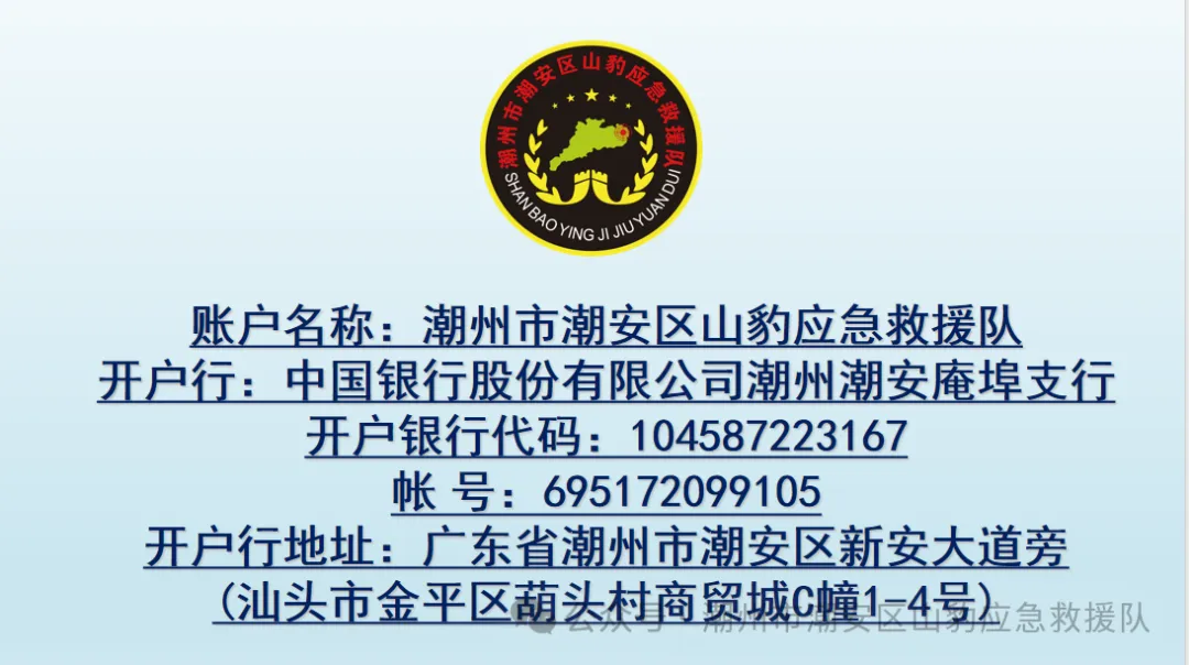 山高路远,初心如磐;风雨兼程,使命在肩。潮州市潮安区山豹应急救援队将永远做党和人民信赖的“召之即来、来之能战、战之必胜”的应急铁军,以钢铁意志对抗一切灾害,以赤胆忠心守护一方平安,在守护人民群众生命财产安全的道路上勇毅前行,为潮安乃至潮州的安全稳定与高质量发展贡献源源不断的山豹力量!