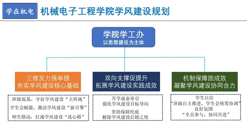 本年度,学院紧扣立德树人根本任务,构建“思政引领为导向,班级、学生会、师生联动三维发力,升学就业、资助保障双向支撑”的学风建设总框架,聚焦学生学习成长核心需求,以务实举措破解学风建设关键问题,推动形成“全员参与、协同推进、常态长效”的学风建设格局,为培育兼具家国情怀与专业素养的新时代机械电子人才筑牢学习根基。