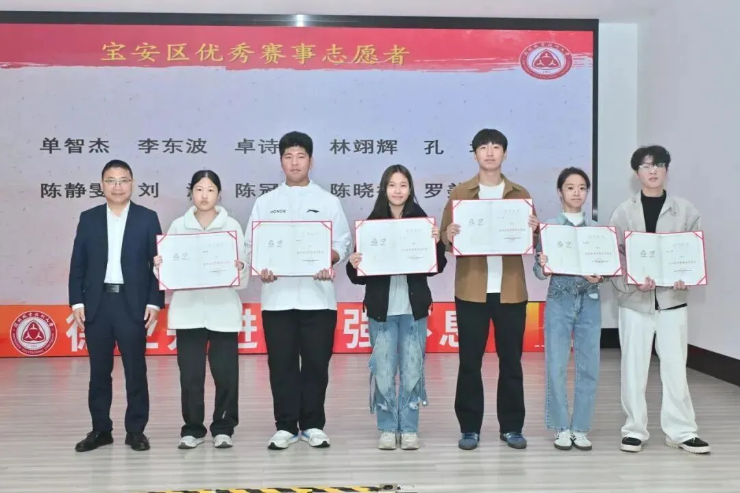 尤为激动人心的是校级与区级重磅荣誉的颁发。肖训珏等40名同学凭借其贯穿全程的突出表现、过硬综合素养与无私奉献,荣获“十五运校志愿者优秀个人奖”,这份荣誉代表了学校对他们工作的最高认可。而颁奖盛典的至高荣誉——“宝安区优秀赛会志愿者”称号,则花落10位核心骨干志愿者。他们以极致的投入、出色的领导力和模范带头作用,成为全院乃至全区志愿者的标杆,这份由宝安区赛委会志愿者部授予的官方表彰,沉甸甸地镌刻了他们的卓越功绩。