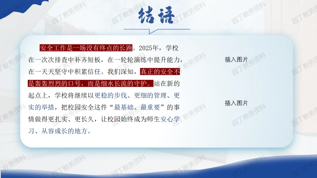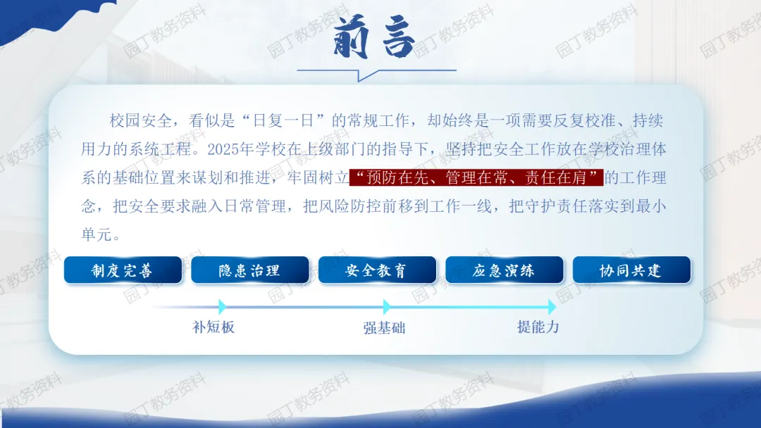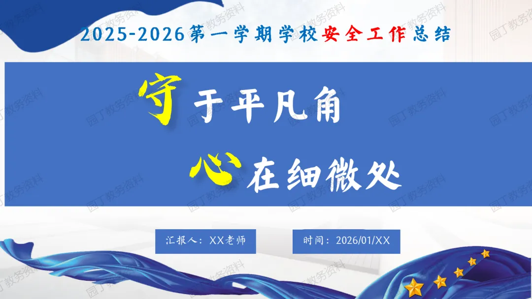 现在好!我是志远,如果你也是一名班主任老师,每天除了完成上课任务,还要加班制作整理班级资料、制作主题班会课件PPT资料,期中期末制作家长会课件PPT,那么请关注下方的“园丁教务资料库”,我们将每天更新以上资料,让我们风雨同路、助您成长!今天分享的主题是:2025年秋季学期安全工作总结:“守”于平凡角,“心”在细微处【发言稿+PPT】(PPT课件共20页)获取完整版课件请关注文末公众号!1、关注下方👇👇👇公众号获取完整版课件(课件编号3774)完整版无水印可编辑修改!2、点击下方图片👇👇👇,打开小程序,可自助下载资料,课件下载后无水印、可编辑、可修改!