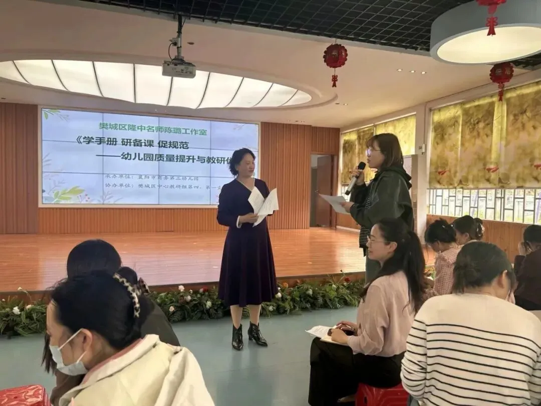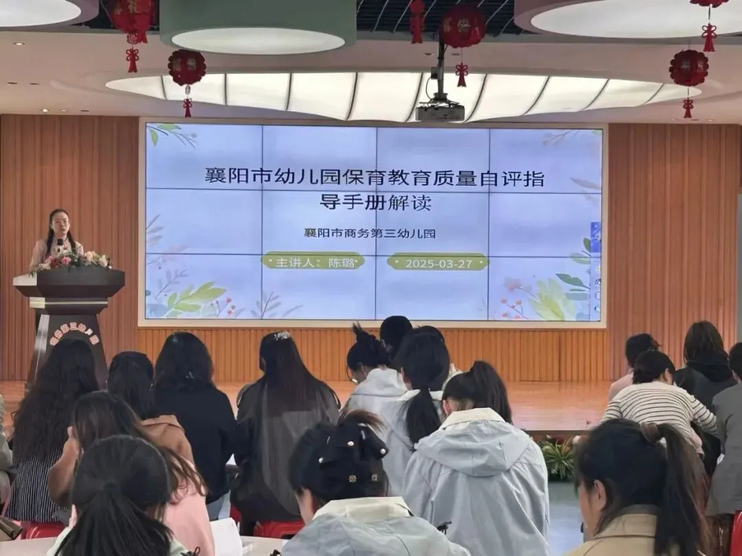 3月27日,联合樊城区学前教育中心教研组等单位,在襄阳市商务第三幼儿园(现樊城第六幼儿园)举办 “学手册・研备课・促规范” 专题活动。工作室主持人陈璐园长深耕行业前沿,深度解读《襄阳市幼儿园保育教育质量自评指导手册》,系统梳理办园方向、保育安全、教育过程等五大核心维度的规范要求,为园所规范化发展提供专业遵循;同步开展集体备课专题研讨,以《春天在哪里》主题为载体开展集智备课实践,手把手指导教师掌握科学备课模板的应用方法,有效提升教学目标达成度与活动连贯性,助力教师夯实教学基本功。