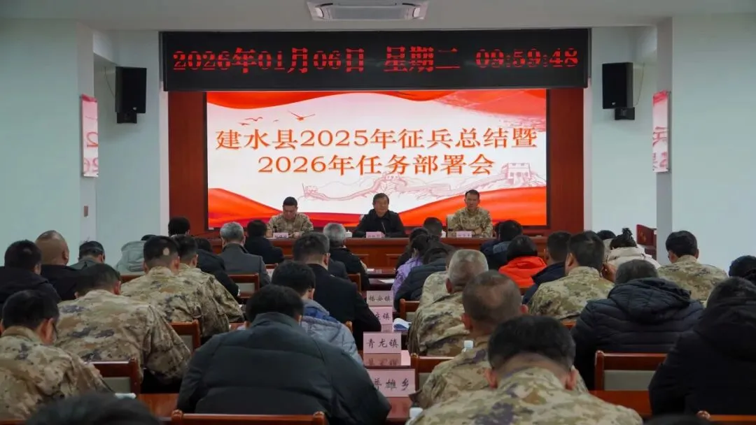 1月6日,建水县召开2025年征兵工作总结暨2026年征兵任务部署会,传达红河州2025年征兵总结部署暨形势分析会议精神,总结我县2025年征兵工作并安排部署2026年征兵任务。县委副书记、县长、县征兵领导小组组长钟红荘出席会议并讲话,县委常委、县人武部政委杨伟坤主持会议,县征兵领导小组常务副组长、县人武部部长郑华平总结2025年征兵工作,部署2026年征兵任务。