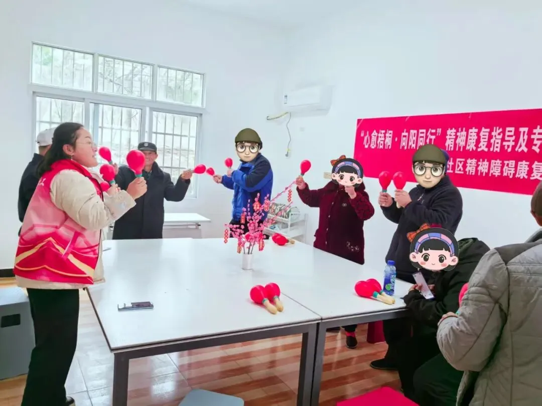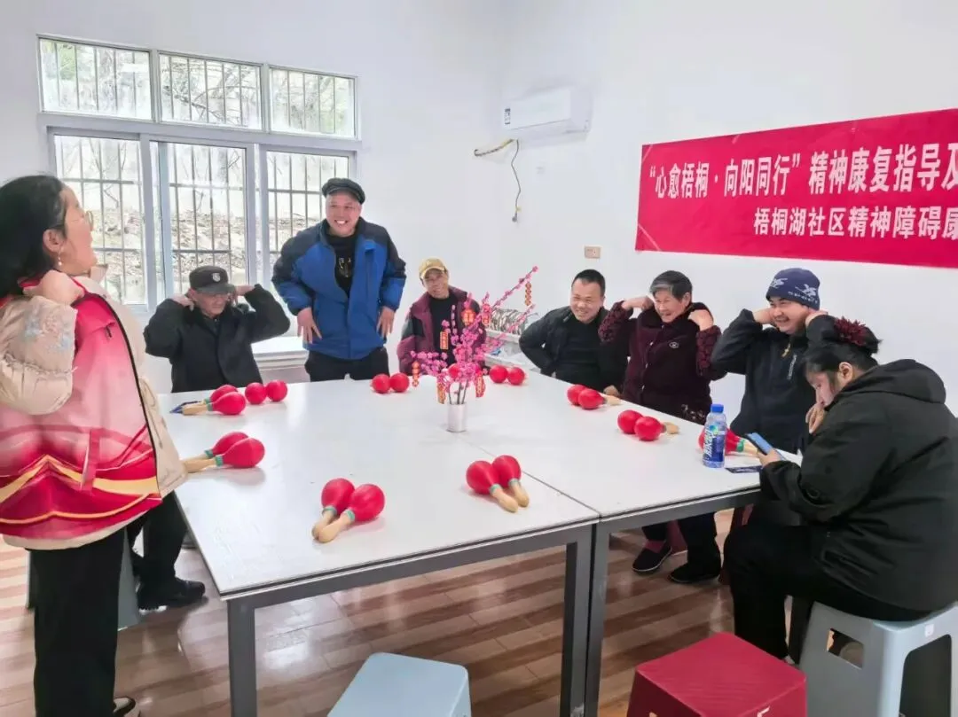 12月31日在梧桐湖社区精神障碍康复中心展开了“沙锤传情・友伴同行——精康群体社交能力提升活动”。这场活动,不仅让参与者们在趣味互动中放松了身心、提升了社交能力,更让他们感受到了社区的关怀与陪伴。