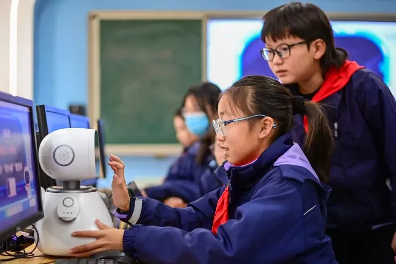 12月5日,杭州市钱塘区学林小学的学生在人工智能通识课上对人工智能机器人进行编程。 新华社记者 江汉 摄
