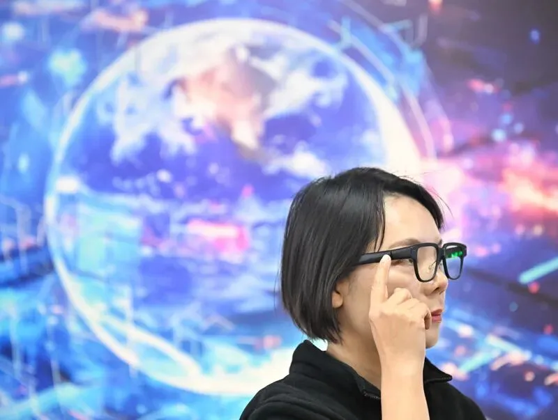 12月4日,在“AI·镜界—南京人工智能生态街区”,工作人员展示一款AI眼镜。 新华社记者 季春鹏 摄