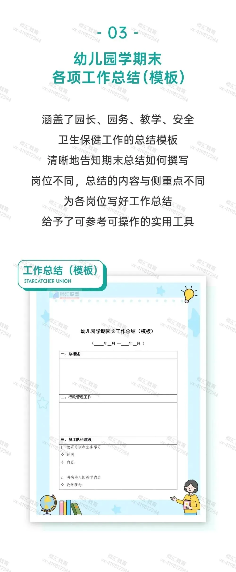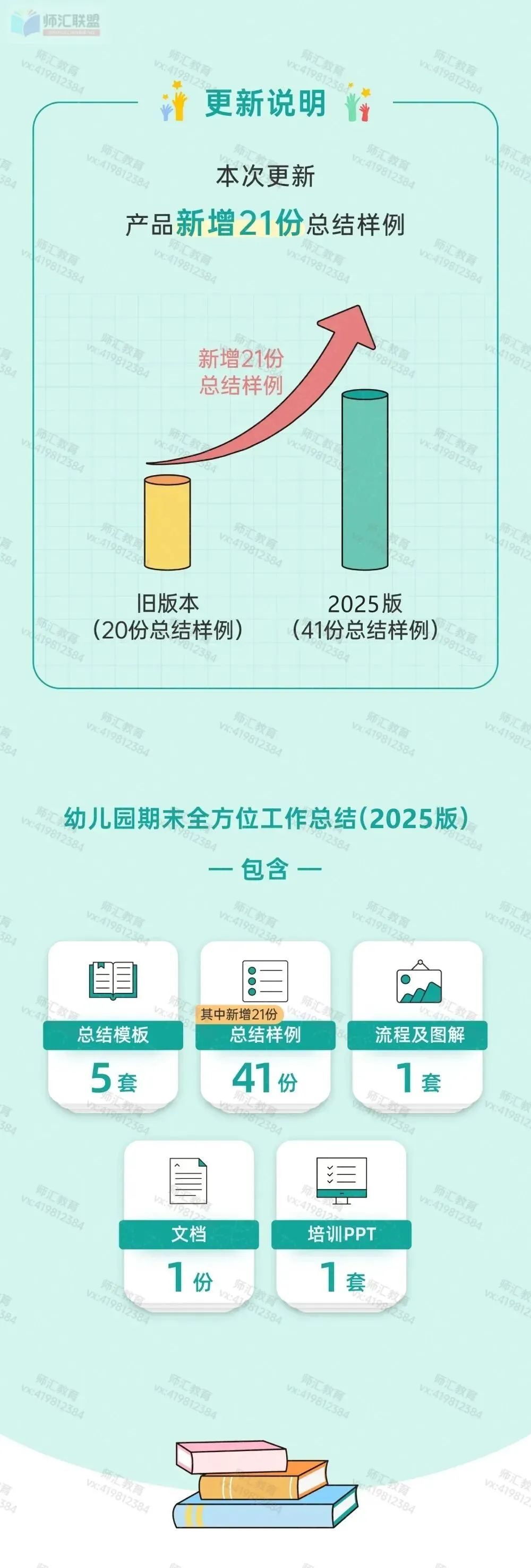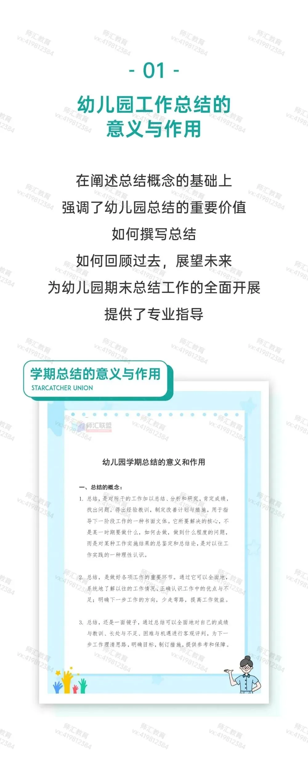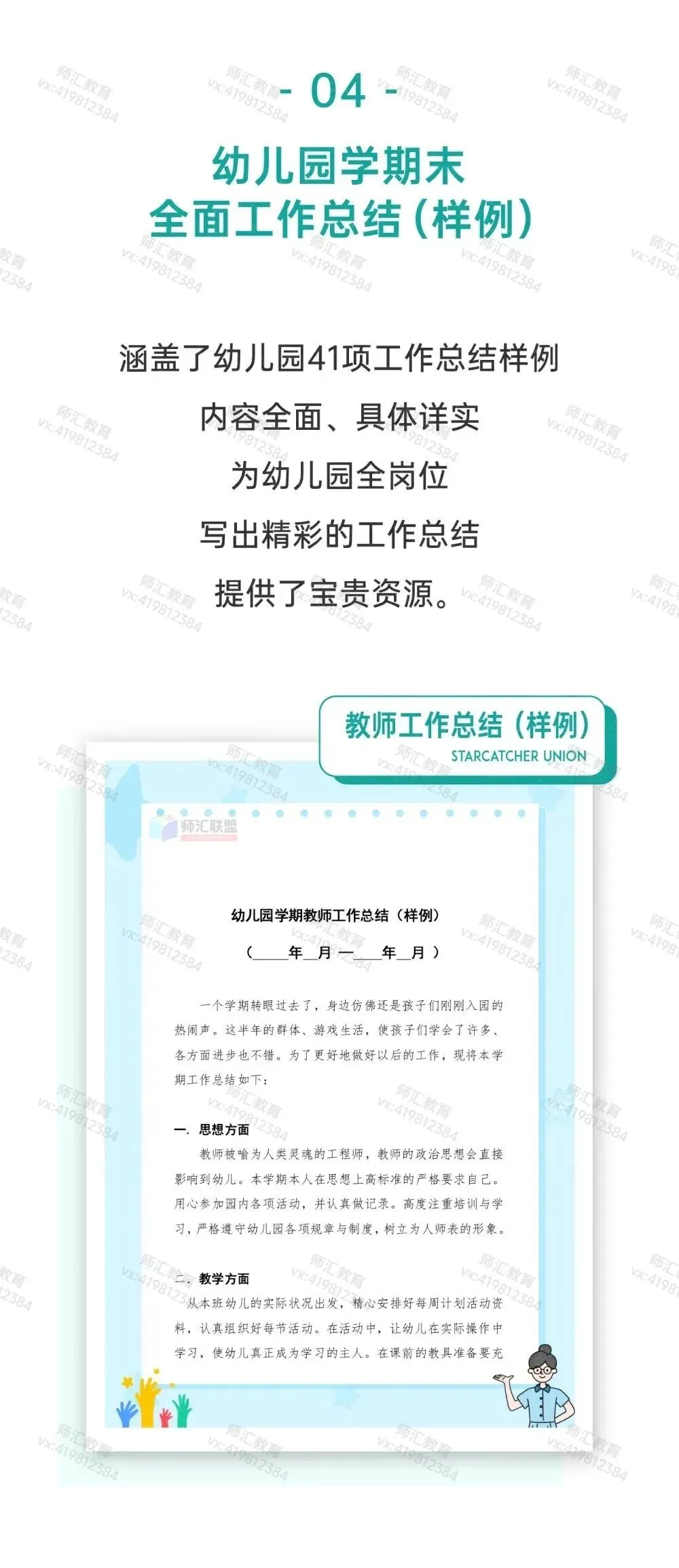 本套资料由师汇联盟整理《幼儿园期末全方位工作总结》(2025版),描述了总结的意义和作用,捋顺了期末总结的工作流程,覆盖5套期末总结的模板,41份总结样例,内容全面、具体详实,助力幼儿园全岗位写出精彩的工作总结!