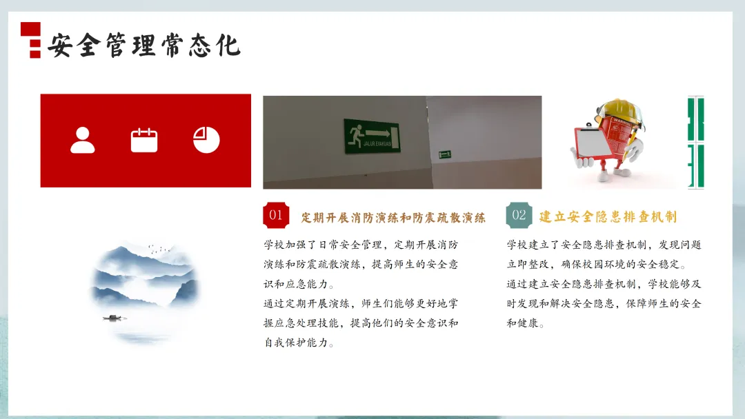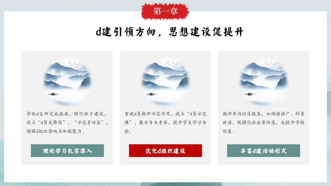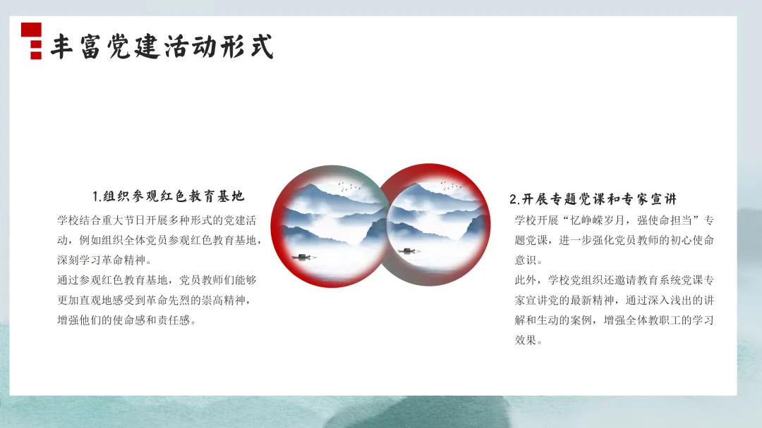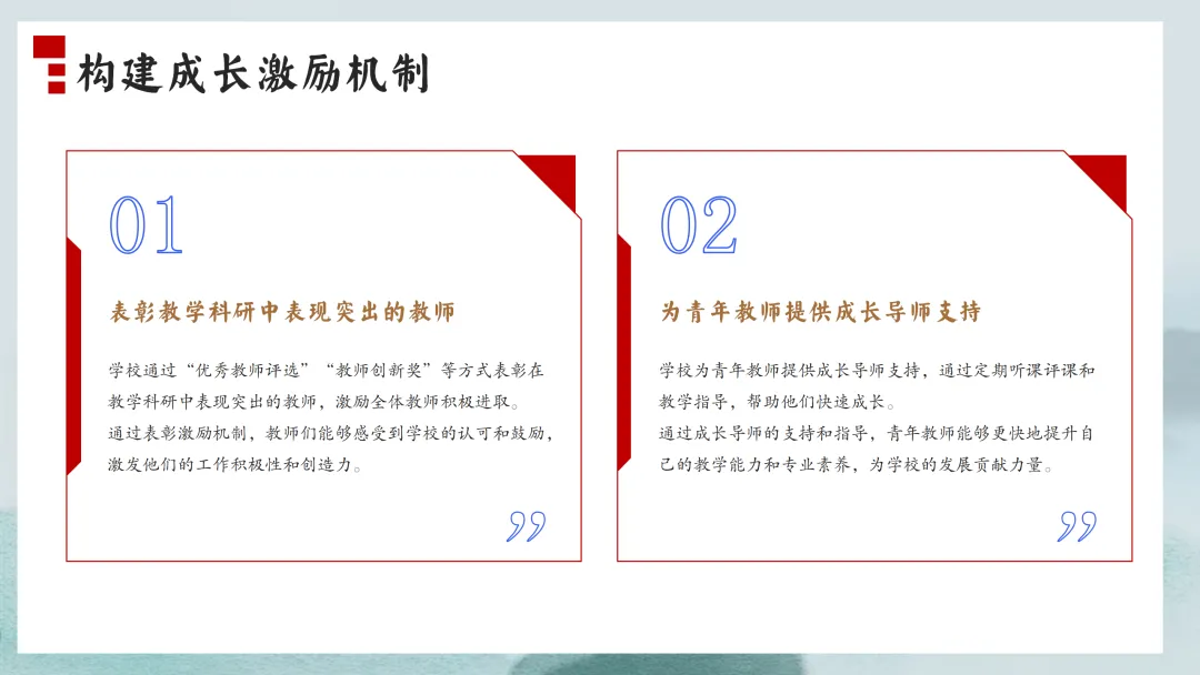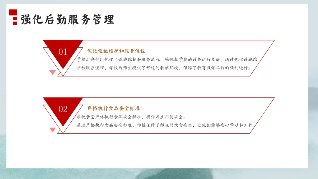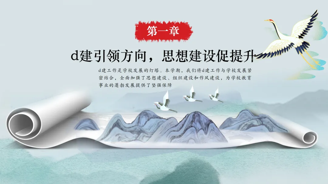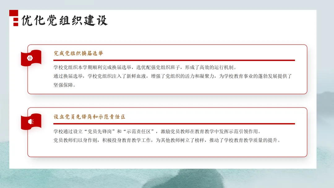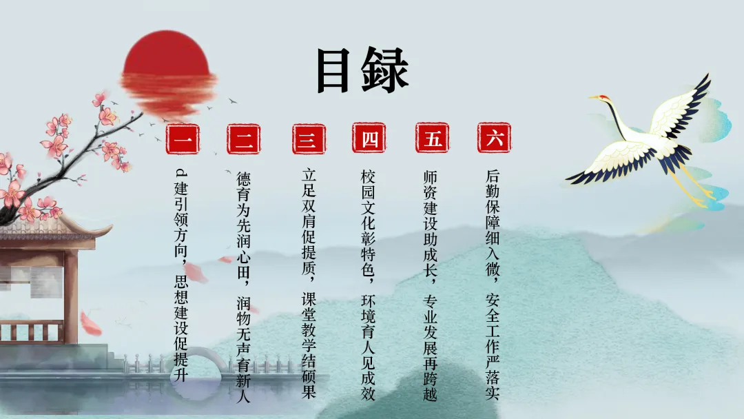 首先,让我们来看一下本次汇报的主要内容。本次汇报将分为六个部分,分别是党建引领方向,思想建设促提升;德育为先润心田,润物无声育新人;立足“双减”促提质,课堂教学结硕果;校园文化彰特色,环境育人见成效;师资建设助成长,专业发展再跨越;后勤保障细致入微,安全工作严抓落实。