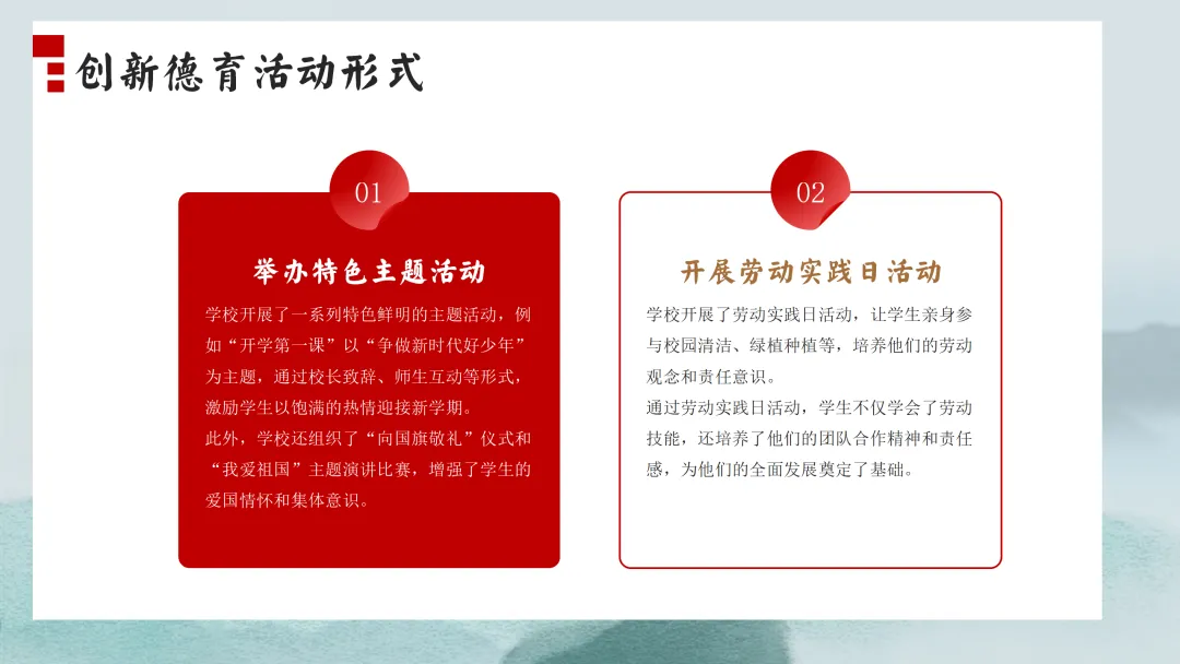 在创新德育活动形式方面,我们举办了特色主题活动。学校开展了一系列特色鲜明的主题活动,例如“开学第一课”以“争做新时代好少年”为主题,通过校长致辞、师生互动等形式,激励学生以饱满的热情迎接新学期。此外,学校还组织了“向国旗敬礼”仪式和“我爱祖国”主题演讲比赛,增强了学生的爱国情怀和集体意识。