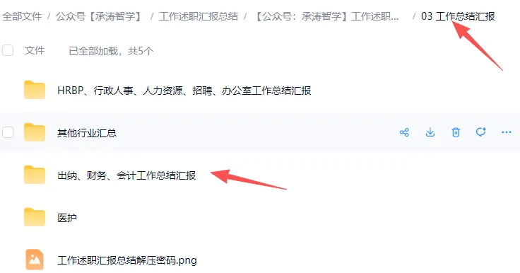 在编号03的工作总结汇报之出纳、财务、会计文件夹里,按照文件名对应查找即可。