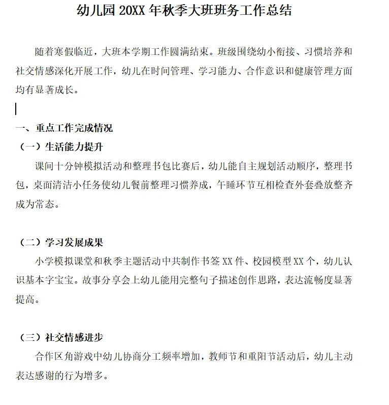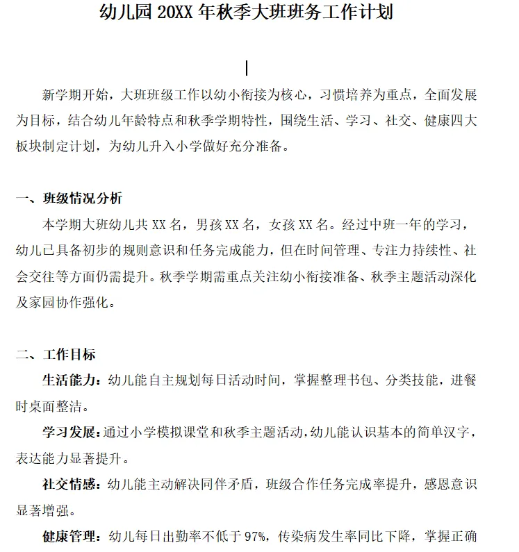 随着寒假临近,大班本学期工作圆满结束。班级围绕幼小衔接,习惯培养和社交情感深化开展工作,幼儿在时间管理,学习能力,合作意识和健康管理方面均有显著成长。 课间十分钟模拟活动和整理书包比赛后,幼儿能自主规划活动顺序,整理书包,桌面清洁小任务使幼儿餐前整理习惯养成,午睡环节互相检查外套叠放整齐成为常态。 小学模拟课堂和秋季主题活动中共制作书签XX件,校园模型XX个,幼儿认识基本字宝宝。故事分享会上幼儿能用完整句子描述创作思路,表达流畅度显著提高。 合作区角游戏中幼儿协商分工频率增加,教师节和重阳节活动后,幼儿主动表达感谢的行为增多。 新学期开始,大班班级工作以幼小衔接为核心,习惯培养为重点,全面发展为目标,结合幼儿年龄特点和秋季学期特性,围绕生活,学习,社交,健康四大板块制定计划,为幼儿升入小学做好充分准备。 本学期大班幼儿共XX名,男孩XX名,女孩XX名。经过中班一年的学习,幼儿已具备初步的规则意识和任务完成能力,但在时间管理,专注力持续性,社会交往等方面仍需提升。秋季学期需重点关注幼小衔接准备,秋季主题活动深化及家园协作强化。生活能力:幼儿能自主规划每日活动时间,掌握整理书包,分类技能,进餐时桌面整洁。学习发展:通过小学模拟课堂和秋季主题活动,幼儿能认识基本的简单汉字,表达能力显著提升。社交情感:幼儿能主动解决同伴矛盾,班级合作任务完成率提升,感恩意识显著增强。健康管理:幼儿每日出勤率不低于97%,传染病发生率同比下降,掌握正确