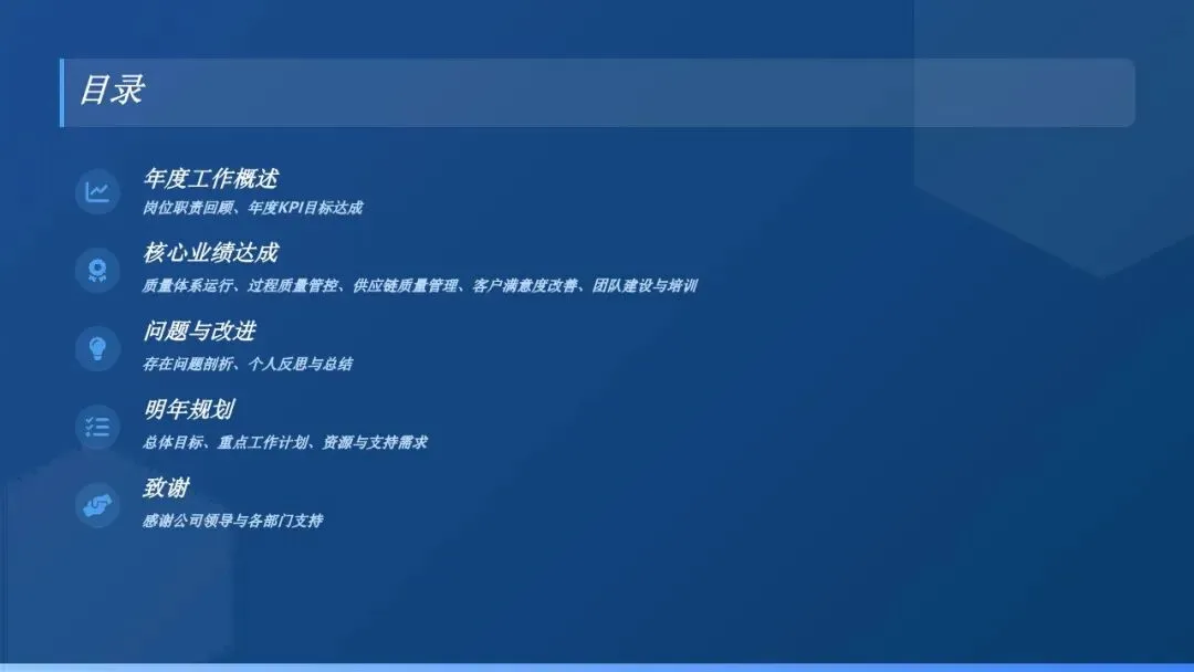 过去一年,在公司领导的正确指引下,在各部门的紧密配合与支持下,我始终秉持“质量是企业生命线”的核心理念,全面负责公司质量管理体系的搭建、运行、优化及质量管控各项工作。围绕年度质量目标,我带领质量团队真抓实干、攻坚克难,有效提升了产品质量稳定性,降低了质量损失,为公司经营发展筑牢了质量根基。现将全年工作情况、存在不足及未来计划向大家作详细汇报,请予评议。