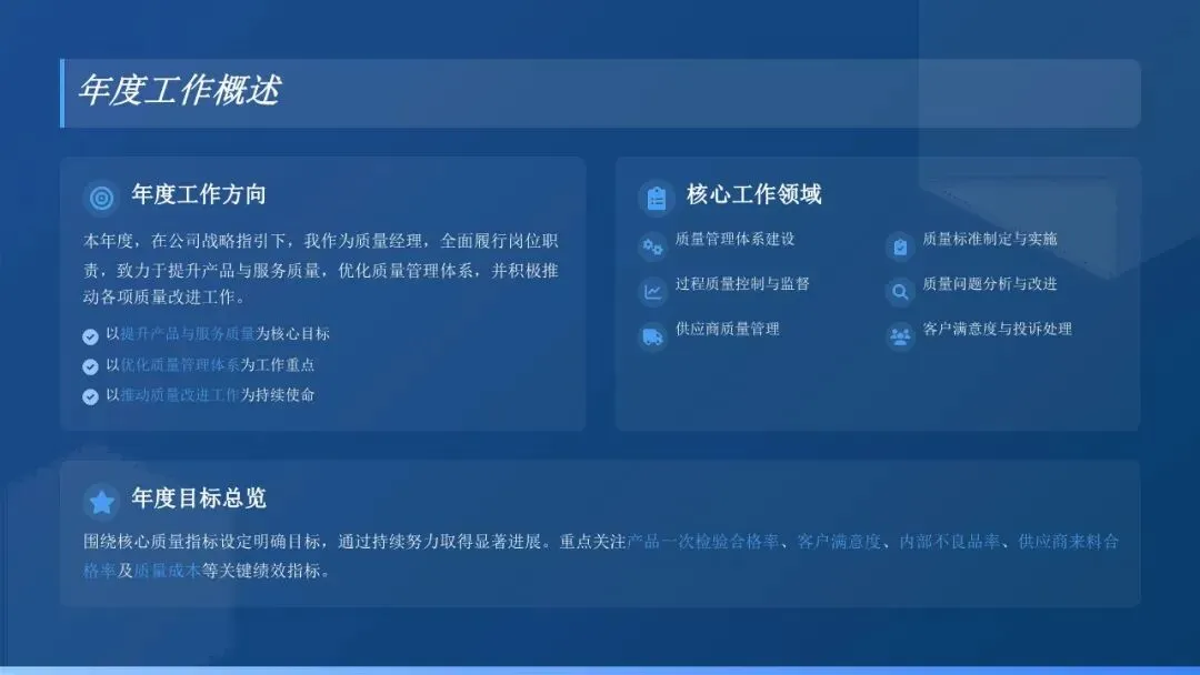 本年度,我的核心工作目标是:完善质量管理体系,提升过程质量控制能力,降低产品不良率,提高客户满意度。围绕这一目标,我牵头推进了质量管理体系换版升级、关键工序质量管控强化、质量检验流程优化、质量培训赋能等重点工作。全年累计组织质量专题会议XX次,处理质量异常问题XX起,开展质量培训XX场,覆盖人员XX人次,推动各项质量指标均得到有效改善,基本完成年度质量工作任务。