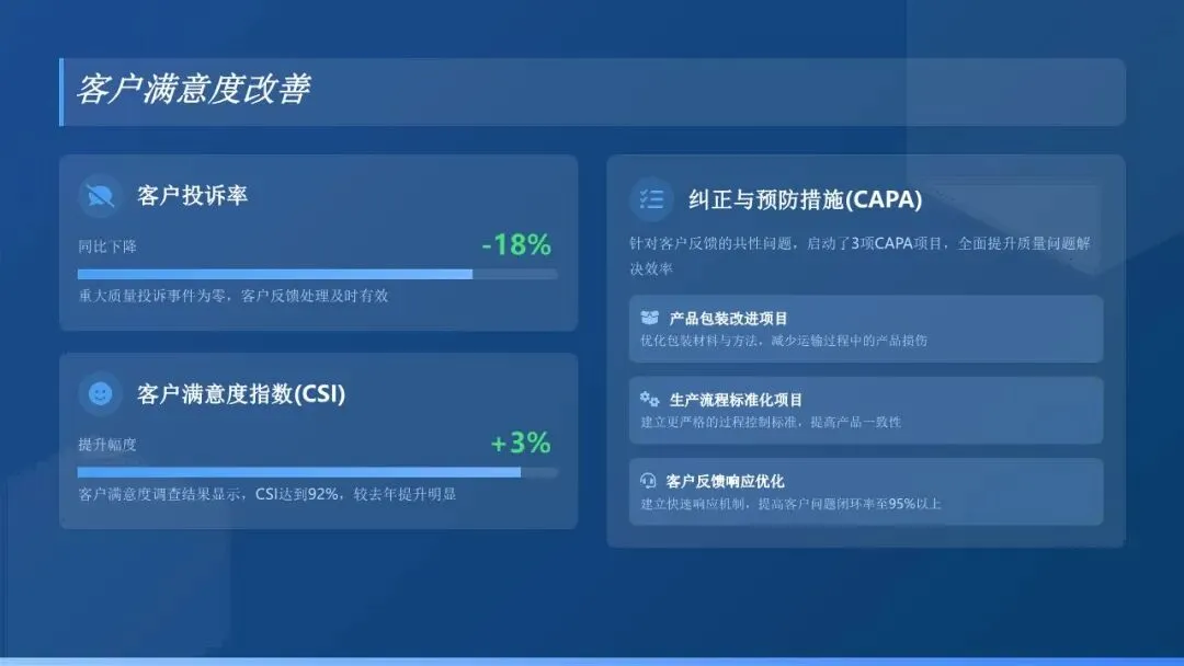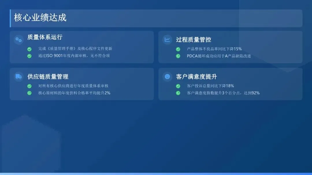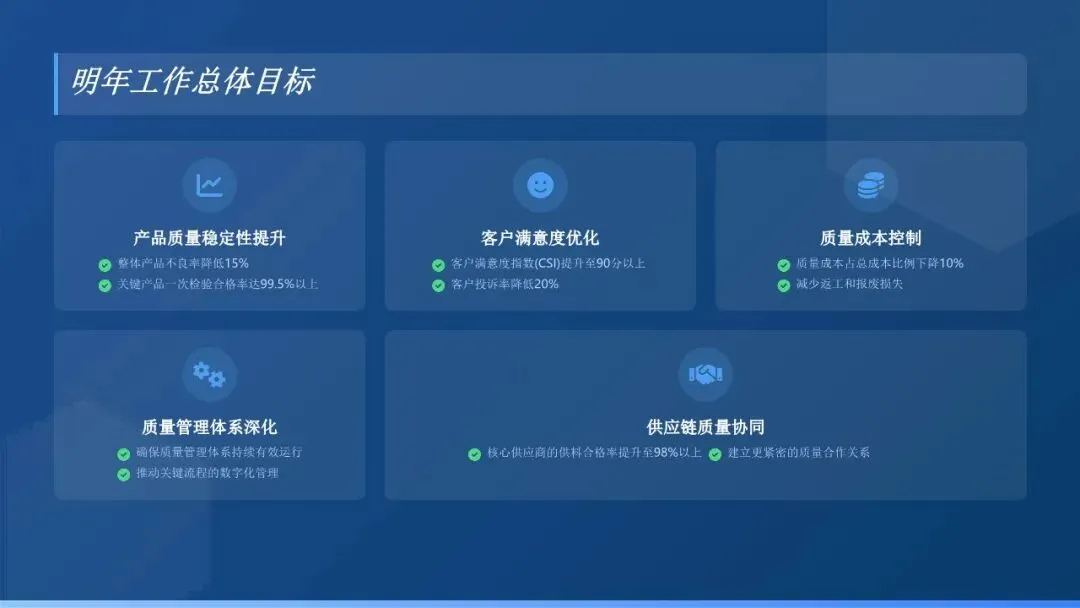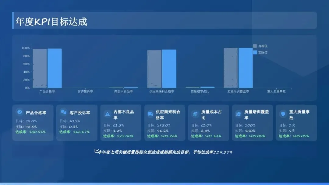 2. 强化质量目标管理:建立健全质量目标分解与考核机制,将公司年度质量目标细化分解至各部门、各车间及关键岗位,明确责任主体、考核标准及奖惩措施。每月对各部门质量目标完成情况进行统计分析,及时发现问题并督促整改,确保质量目标落地见效。本年度,公司产品一次合格率达到XX%,较去年提升XX个百分点;客户投诉率降至XX‰,较去年下降XX个千分点,核心质量指标均超额完成年度目标。