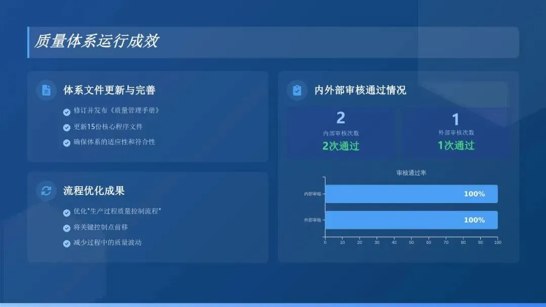 1. 推进体系换版与认证:针对原有质量管理体系存在的不足,结合最新行业标准及客户需求,牵头组织开展ISO9001:2015体系换版工作。组织各部门梳理业务流程,修订质量手册、程序文件XX份,优化流程XX项,确保体系文件的适宜性、充分性和有效性。全年顺利通过第三方体系审核及客户二方审核,审核无严重不符合项,一般不符合项整改完成率100%,有效提升了公司质量管理的规范化水平。