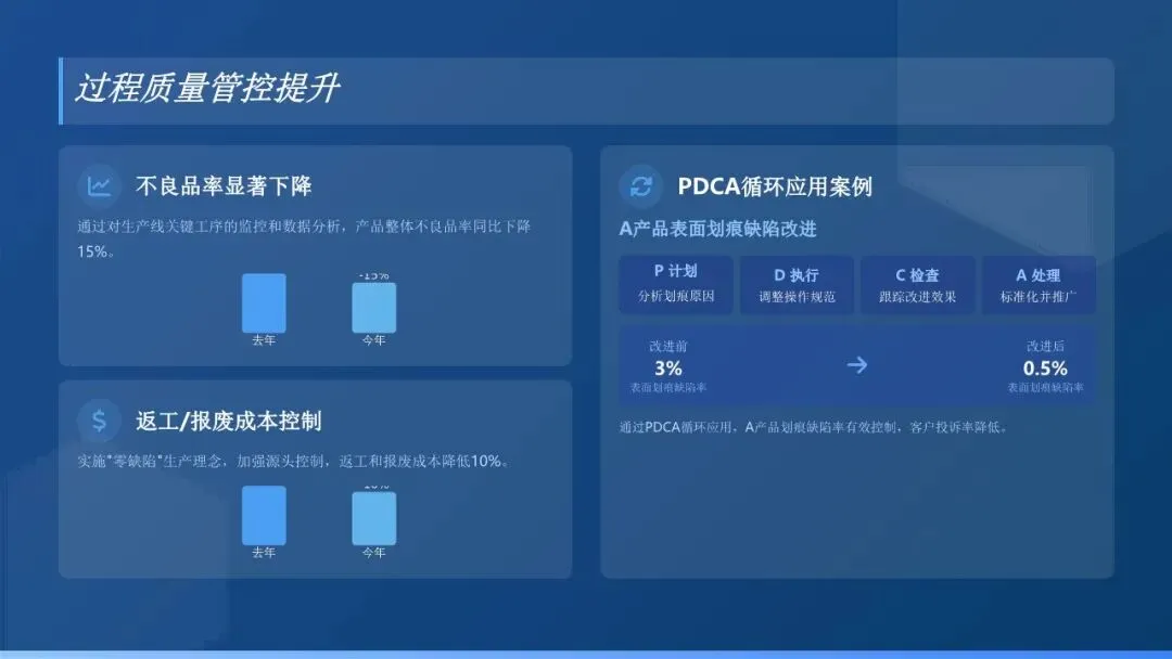 2. 开展质量改进项目:围绕产品质量痛点和难点问题,牵头组织开展QC小组活动和质量改进项目。全年立项质量改进项目XX项,其中XX项项目取得显著成效,累计降低质量损失XX万元。例如,针对XX产品的XX质量问题,通过QC小组活动,优化了生产工艺参数,使该问题不良率从XX%降至XX%,年节约成本XX万元。