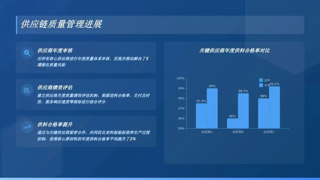 1. 加强进料检验管控:优化进料检验流程,明确各类原材料、零部件的检验标准和抽样方案,强化对关键供应商的质量审核与管控。建立供应商质量档案,对供应商进行分级管理,全年新增合格供应商XX家,淘汰不合格供应商XX家。通过加强进料检验,原材料不良率降至XX%,较去年下降XX个百分点,有效避免了不合格原材料流入生产环节。