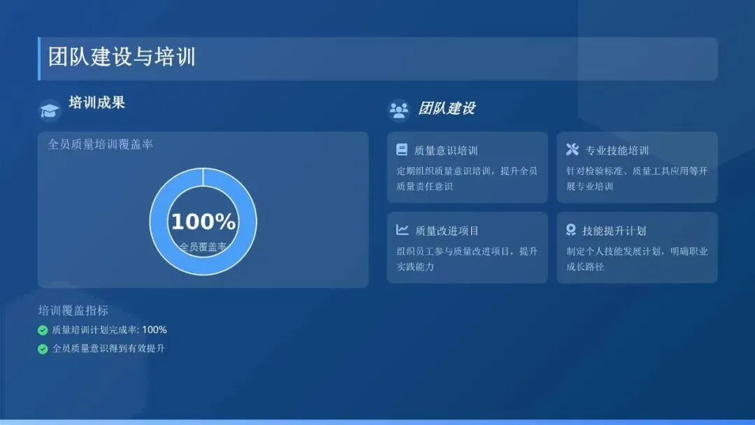 2. 开展全员质量培训:全年累计开展质量培训XX场,培训人员XX人次,员工质量培训覆盖率达到100%。通过培训,员工对质量管理体系和相关标准的认知度显著提升,掌握了基本的质量控制方法和工具,全员质量意识和质量责任感进一步增强。同时,组织开展质量知识竞赛、质量案例分享等活动,营造了“人人关心质量、重视质量、负责质量”的良好氛围。