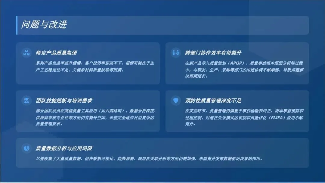2. 过程质量管控精细化程度有待提升:虽然生产过程质量稳定性有所提升,但部分关键工序的过程能力仍有待加强,对一些潜在的过程质量隐患识别不够及时、全面,质量控制的精细化水平需要进一步提高。