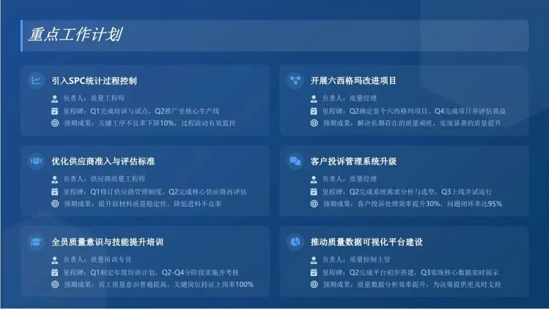 1. 制定针对性培训计划:结合各部门岗位需求,制定全年质量培训计划,涵盖质量管理体系、检验标准、过程控制、质量工具应用等多个方面。采用内部讲师授课、外部专家培训、案例分析、现场实操等多种培训形式,提高培训效果。