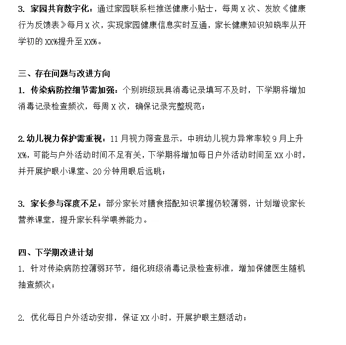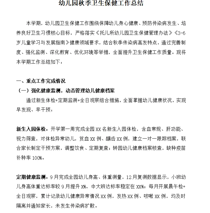本学期,幼儿园卫生保健工作围绕保障幼儿身心健康,预防传染病发生,培养良好卫生习惯核心目标,严格落实《托儿所幼儿园卫生保健管理办法》〈<3-6岁儿童学习与发展指南》健康领域要求,结合秋季传染病高发特点,通过完善制度,强化监测,深化教育,优化环境等举举措,全面提升卫生保健工作质量。现将本学期工作总结如下: 通过新生体检+定期监测+全日观察组合措施,全面掌握幼儿健康状况,实现早发现,早干预:新生入园体检:开学第一周完成全园XX名新生入园体检,含血常规,肝功能,视力筛查,对体检异常幼儿,贫血xx例,龋齿xx例,建立一对一跟踪档案,联合家长制定干预方案,调整饮食,定期复查;转园幼儿健康档案核查,缺种疫苗补种率100%.定期健康监测:9月完成全园幼儿身高,体重测量,12月复测数据显示,小班幼儿身高体重达标率较9月提升X%,中大班达标率稳定在XX%;每月开展晨午检+全日观察,累计记录幼儿健康异常情况xx例,发热xx例,咳嗽xx例,均及时隔离并通知家长,未发生传染病扩散。