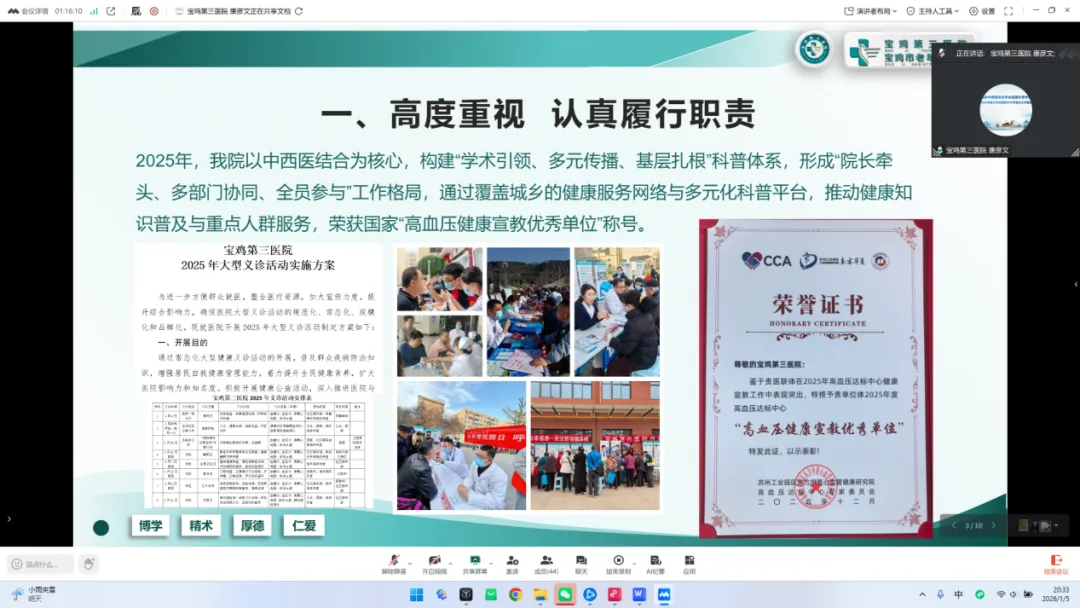 宝鸡第三医院院长康彦文在发言中系统介绍了宝鸡第三医院2025年构建的“中西医结合”健康科普工作体系。该院以“学术引领、多元传播、基层扎根”为框架,形成“院长牵头、多部门协作”的联动机制,医院科普服务队深入社区、田间地头开展活动220余场,切实推动健康知识下沉基层。体现了该院在慢性病防控与健康促进领域的扎实作为与创新实践。