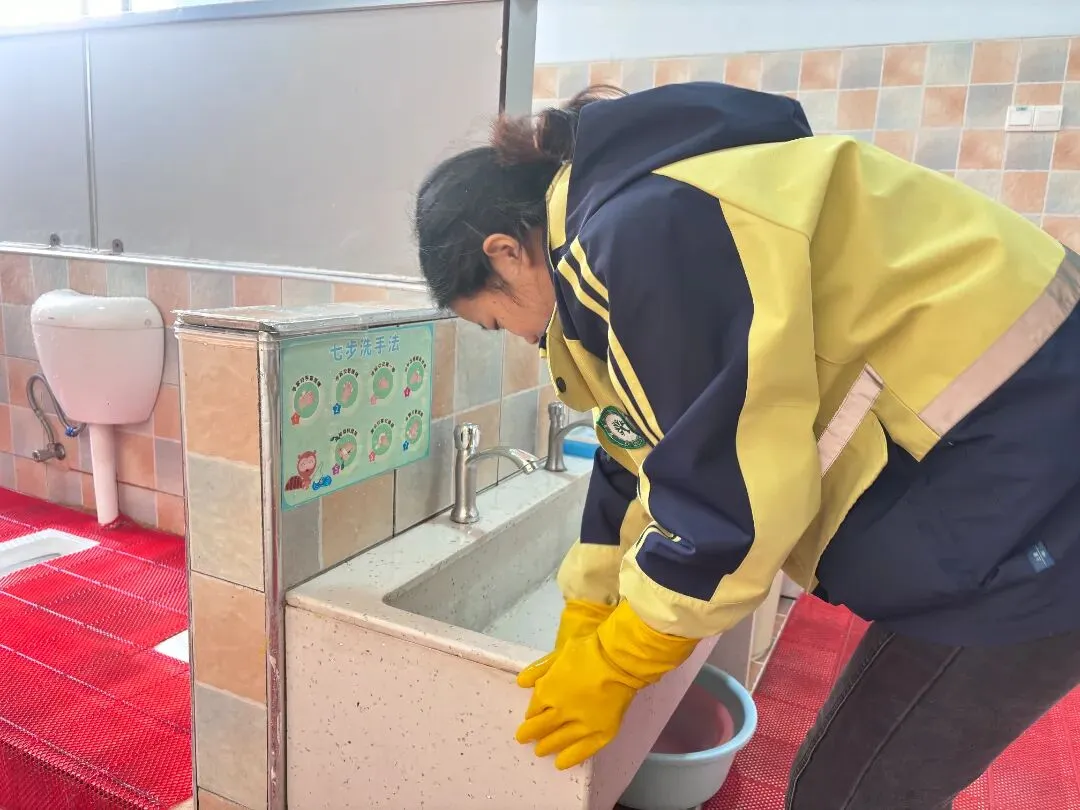 •后勤保洁组制定了精细化清扫清单,每日对园区地面、门窗、楼梯扶手、玩具器械等进行全方位清扫消毒;每周开展一次深度保洁,针对卫生死角“重拳出击”。