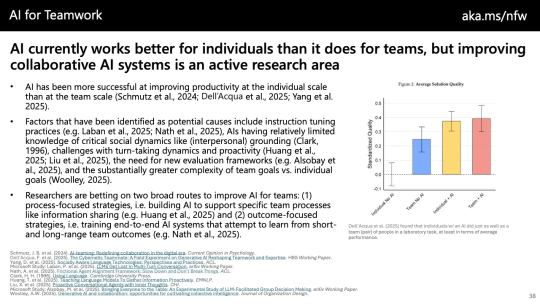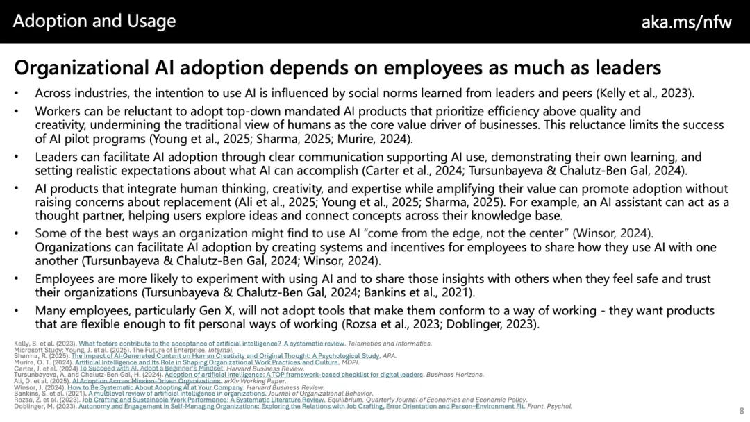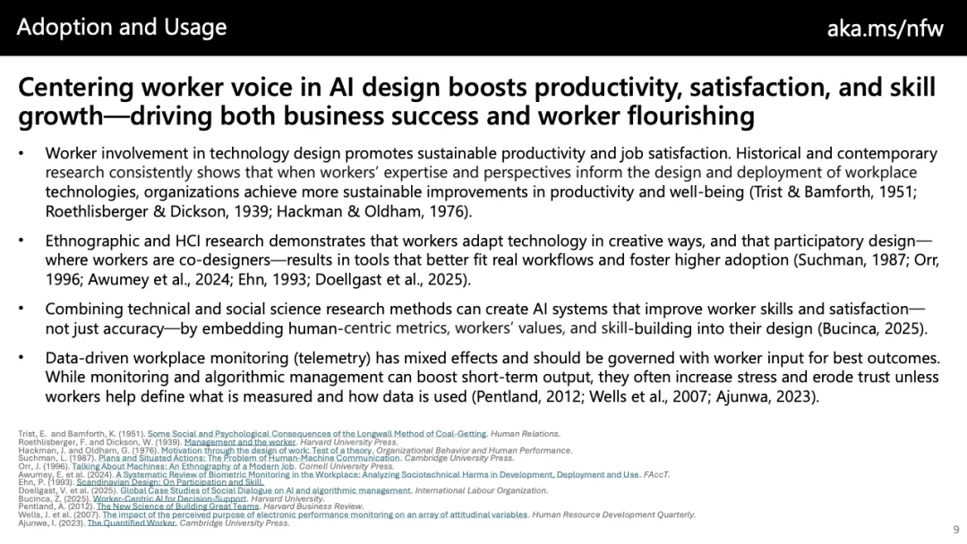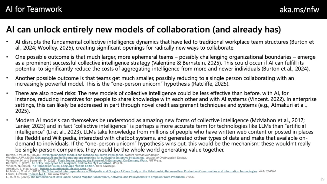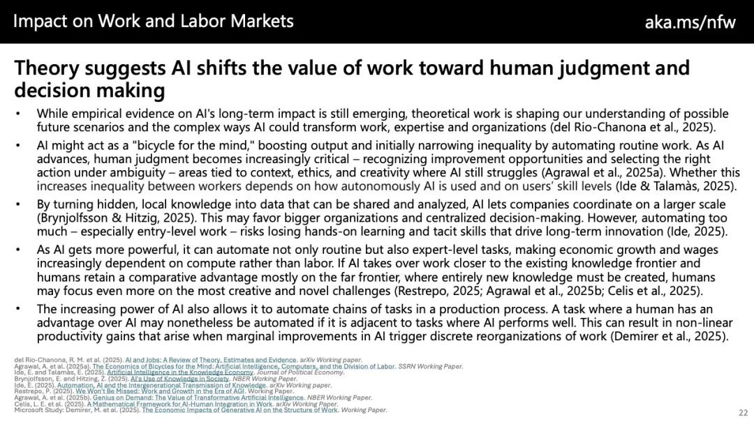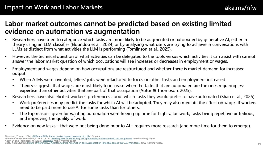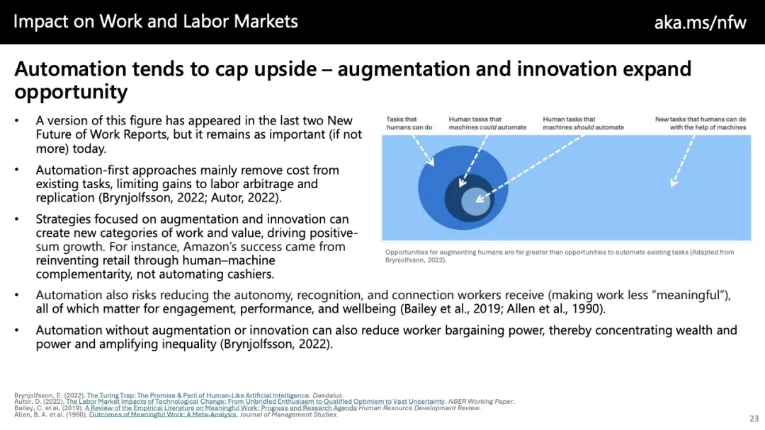 趋势上看,未来工作的核心分水岭并非“是否采用AI”,而在于“如何采用”。以自动化为中心的策略只能带来成本压缩,而以增强与创新为导向的路径,才可能催生新任务、新价值与更高质量的就业。随着AI逐步向团队协作、代理型系统与长期任务推进演化,组织若不能同步重构流程、激励与技能体系,效率红利将难以转化为可持续的生产率跃迁。