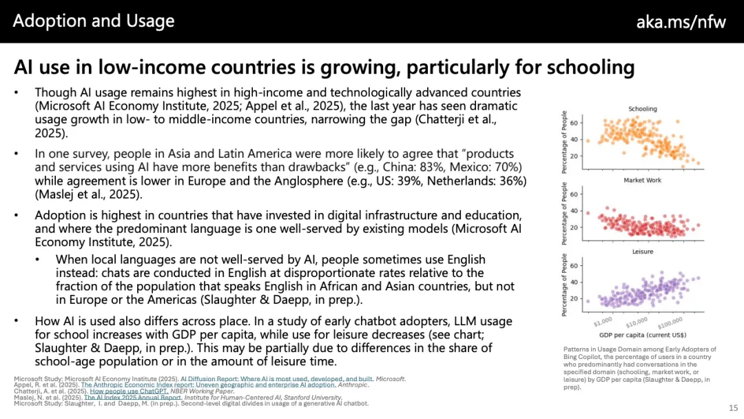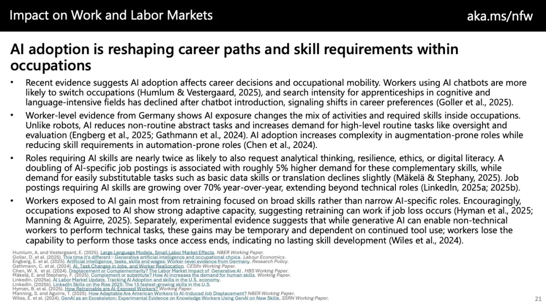 技能结构的变化同样清晰。AI并未简单替代高技能劳动,而是重塑技能组合。要求AI技能的岗位中,对分析能力、伦理意识与数字素养的需求提升约5%,而基础数据处理与翻译等可替代技能需求下降。报告强调,过度依赖AI可能导致“认知去技能化”,尤其在写作、编程与医疗判断等领域,短期效率提升若缺乏配套培训,可能侵蚀长期专业能力。