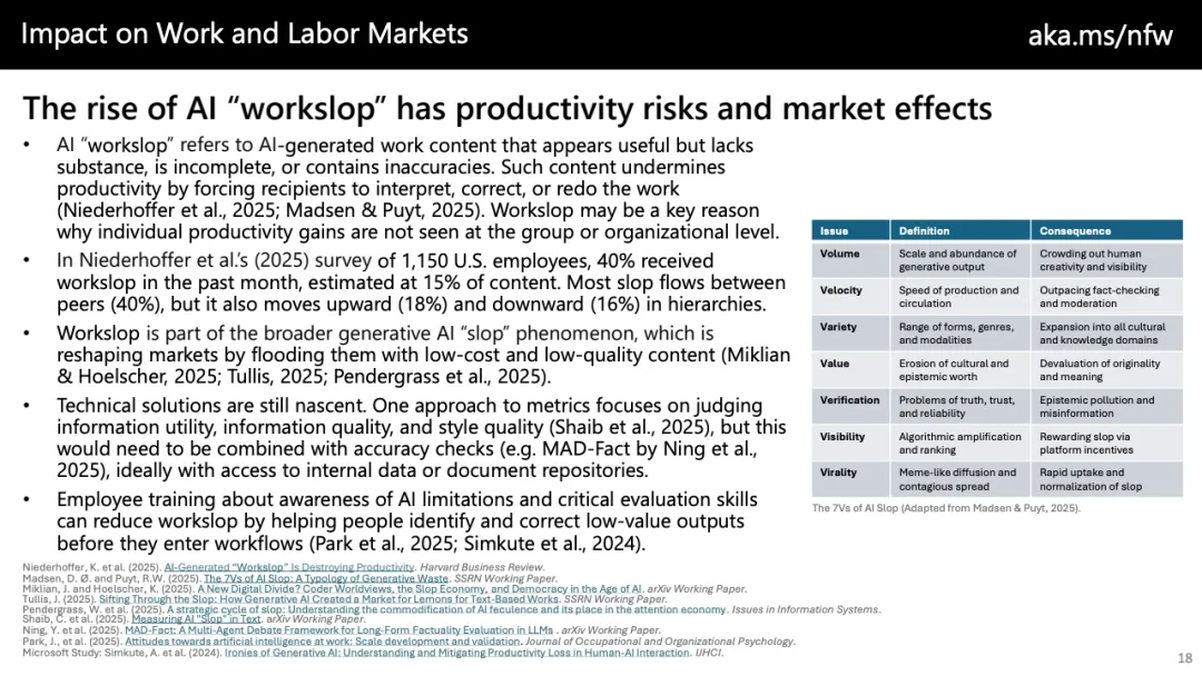 从生产率角度看,AI已在多个高价值任务中释放可量化的时间红利。企业用户普遍反映每日节省40至60分钟不等,在法律、管理等文本密集型任务中,AI可承担80%以上的工作环节。然而,这种效率提升更多停留在个体层面,团队与组织层面的增益尚未同步显现。约40%的受访员工在过去一个月中接收到“低质量AI产出”,这类内容占信息流的15%左右,反而增加了校对与返工成本,削弱了集体生产率。