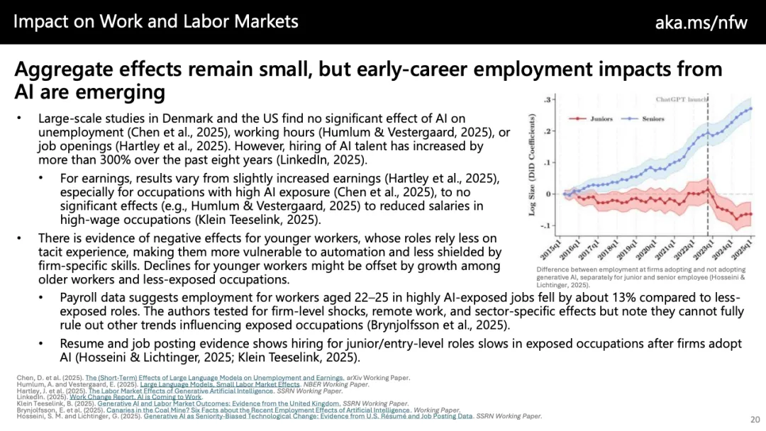 在劳动力市场层面,宏观冲击仍然温和,但结构性变化已现端倪。大规模研究尚未发现AI显著推高失业率或缩短工时,但AI相关岗位招聘在八年内增长超过300%。值得警惕的是,22至25岁、处于高AI暴露岗位的年轻员工,其就业规模相对下降约13%,显示生成式AI可能正在压缩入门级与学习型岗位空间,而经验密集型与监督型角色更具韧性。