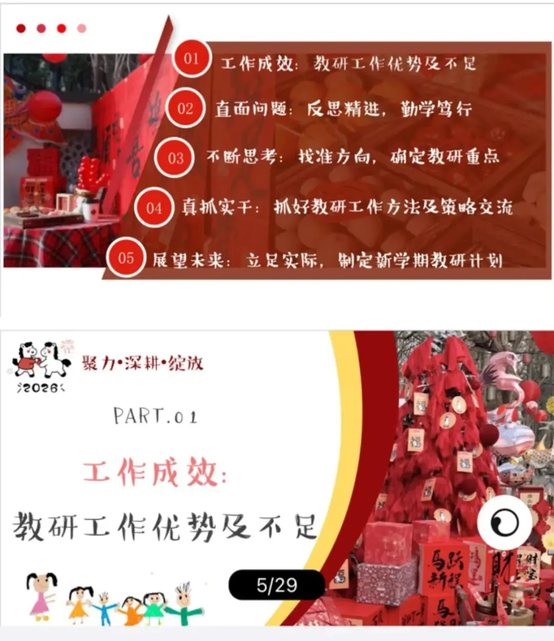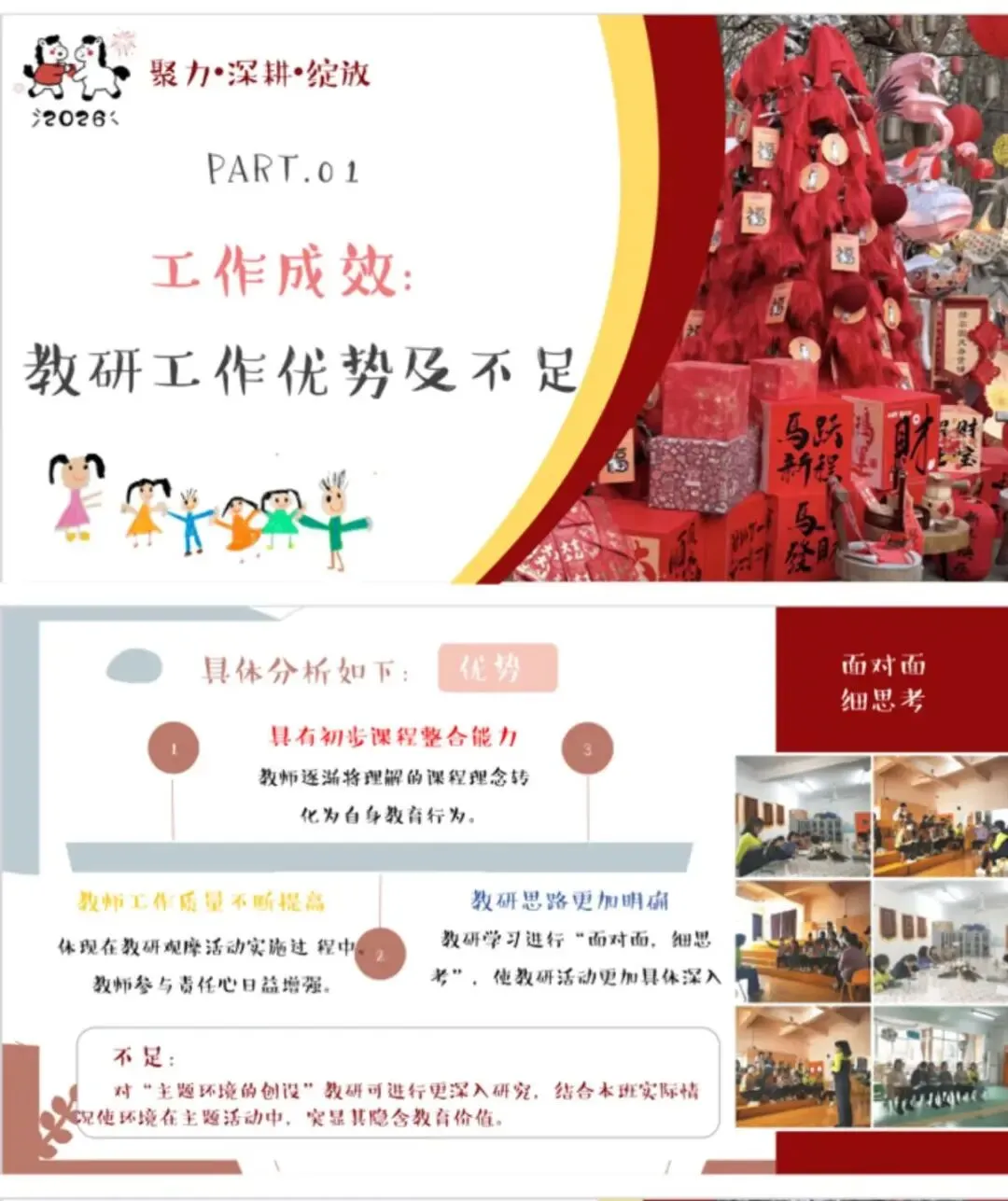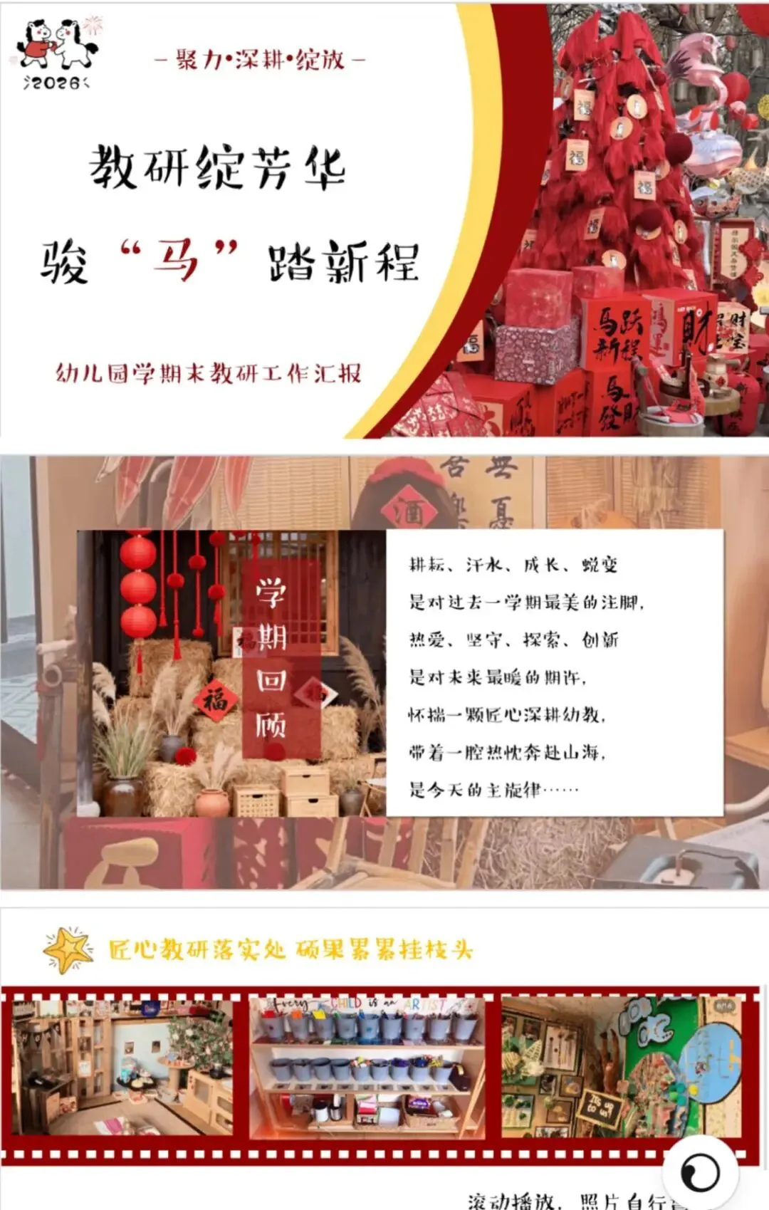 教研是推动幼儿园发展的强劲引擎,为园所进步持续赋能。为切实提升保教质量,让教学与教科研工作走深走实,真正达成以研促教、以教促学、共同成长的效果,我园教研组开展成果汇报活动。[开箱R][开箱R] 教研汇报不仅系统梳理了一学期的教研收获,更在反思中总结经验、蓄力成长,为园所未来发展凝聚前行力量。[加油R][加油R]