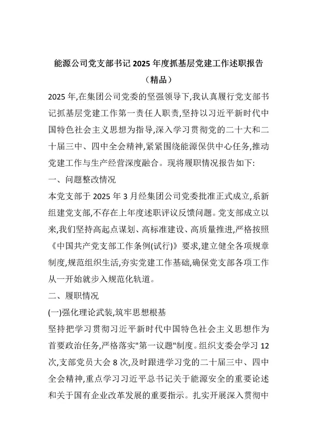 >能源公司党支部书记2025年度抓基层党建工作述职报告