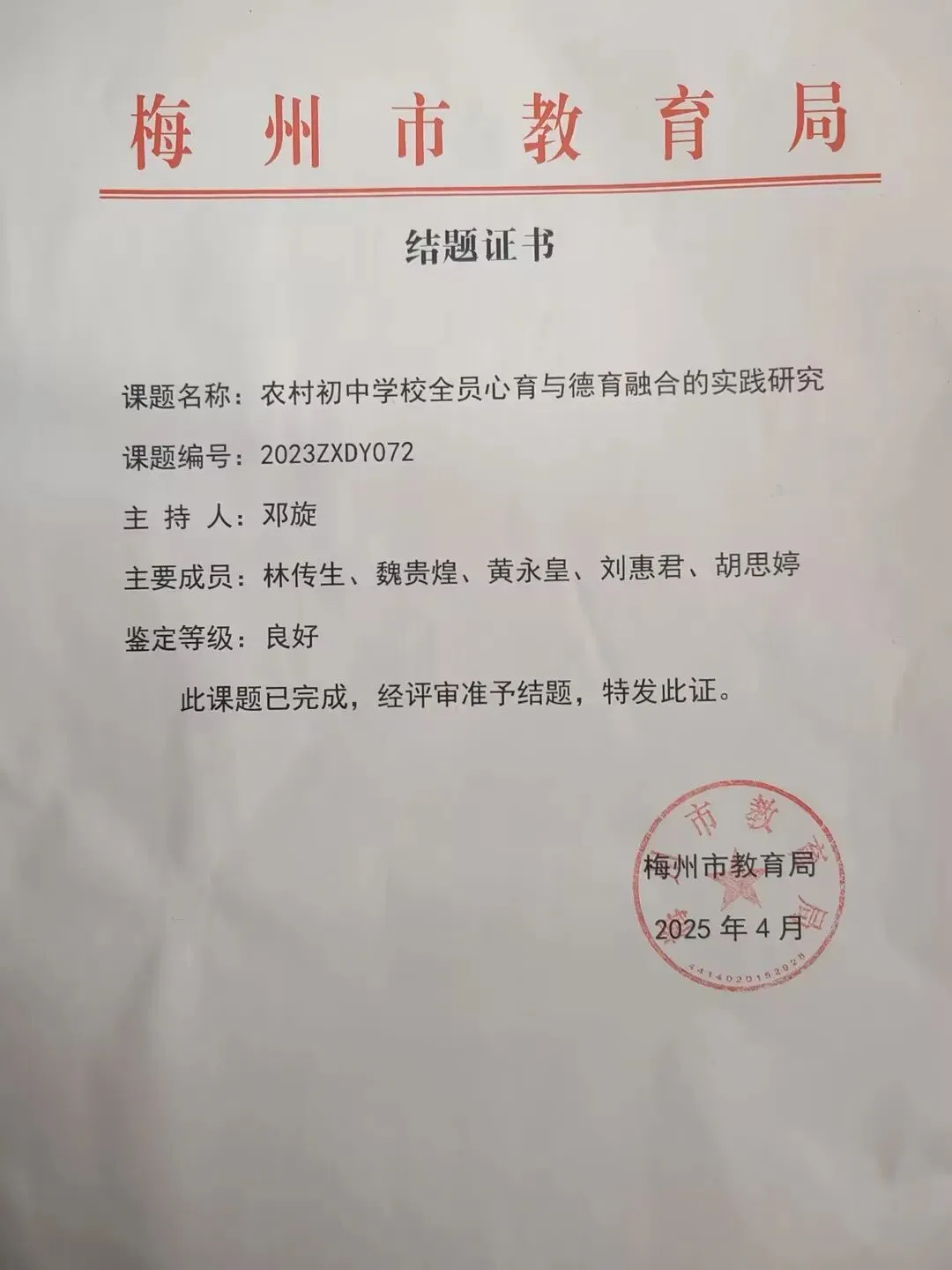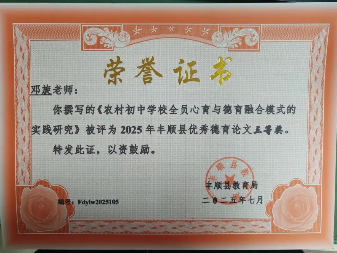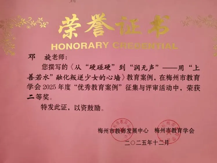 我撰写的育人案例《从“硬碰硬”到“润无声”——用“上善若水”融化叛逆少女的心墙》荣获梅州市教育学会2025年度“优秀教育案例”二等奖,撰写的德育论文《农村初中全员心育与德育融合模式的实践研究》获县优秀德育论文三等奖,这让我更加坚定——实践中的思考,值得被记录与传递。