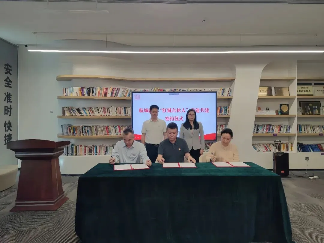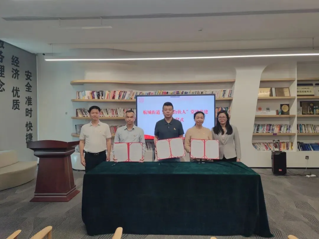 航城商会党支部与跨越速运集团党委、建行航城支行党支部、中山翠亨新区南朗街道工商联(商会)签署结对共建协议,致力在党组织建设、党建品牌打造、资源要素对接、人才交流培养等方面,推动企业优势互补、协同创新和共同发展。