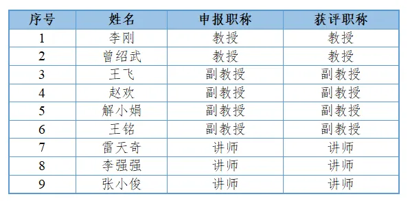 本年度共9人报名职称评审(教授2人、副教授4人、讲师3人),全部通过,晋升率100%。