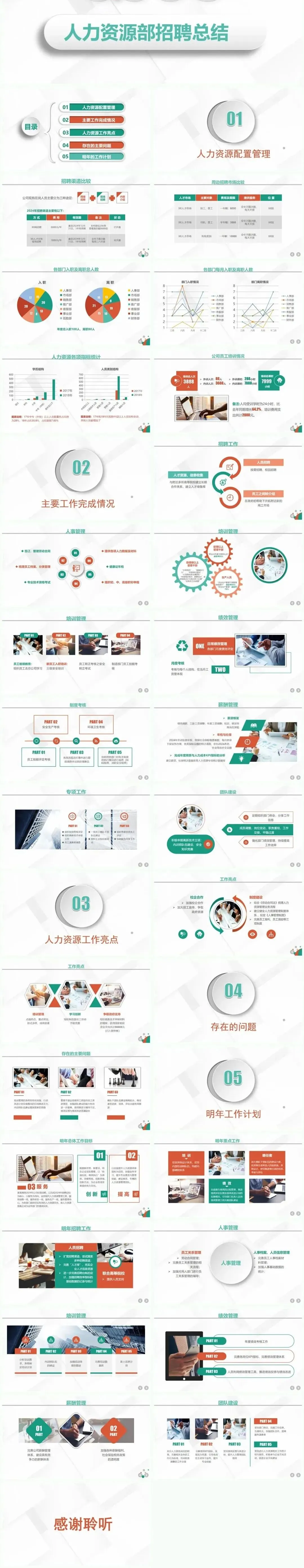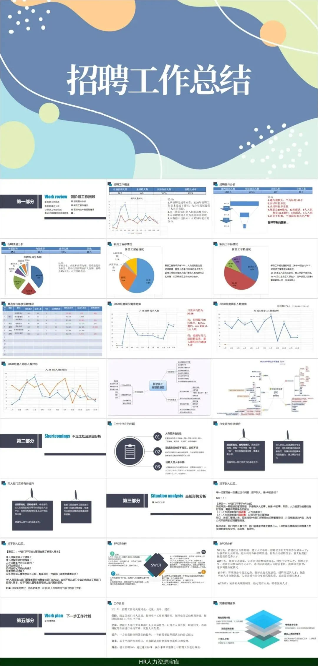 3套招聘工作总结PPT,适合总结述职汇报场景,多图表,对一年工作美观可视化呈现,让人眼前一亮。部分PPT截图展示如下: